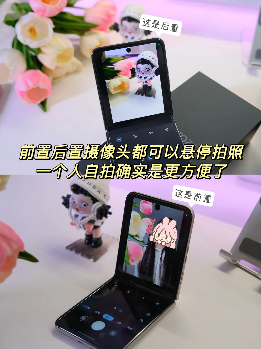 📷拍照功超爱!折叠状态下摇一摇就能打开外屏相机,单手操作时巨方便,可多角度悬停拍照,👋手势倒计时功能,在外面一个人自拍就炒鸡方便~