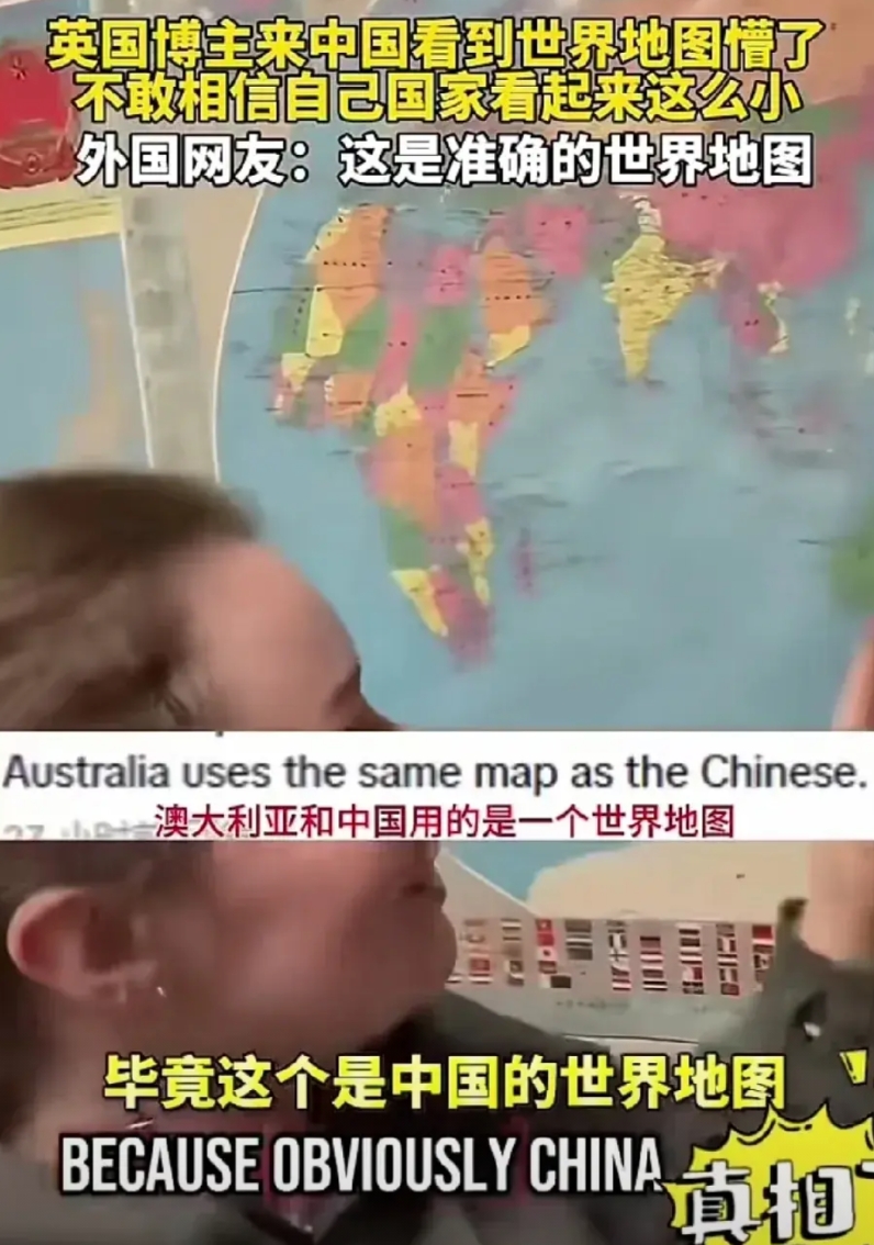 原来真有小国用地图来骗自己的民众,大韩就不用说了,地图整的比俄罗斯还要大,搞得他们民众个个都以为自己是地球最大。 想不到英国也这样子,一个英国留学生来到中国,看了标准世界地图后,发现英国只在地图边缘,只有半个巴掌不到的地方,真的好小。 这位女留学生都尴尬的笑了,解释说中国用的世界地图和我们用的地图不一样,在地图这里空着很大的一块(太平洋),英国地图,英国是在中心位置的。 看得我都不由得尴尬笑了。英国有多大自己不知道嘛,用这种掩耳盗铃的方法骗自己的民众有啥意思? 不得不说,英国还沉浸在往日的荣光,还想着自己是以前日不落帝国,不肯承认自己的没落,找不到自己的位置。 不过我也理解,这也是无奈的事情,如果让自己的国民知道自己的国家只是个小不点,那很容易打击士气。 那就更不好收拾了,大家觉得呢?