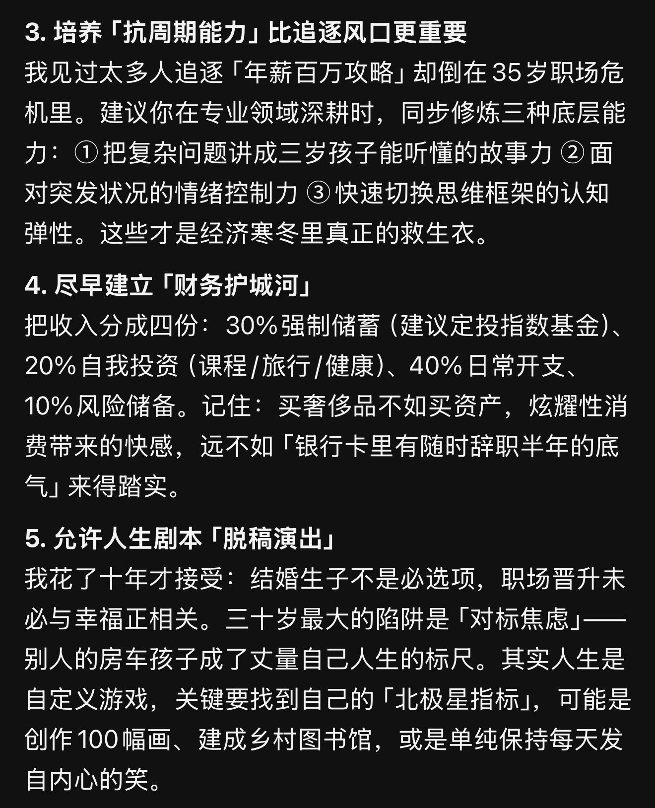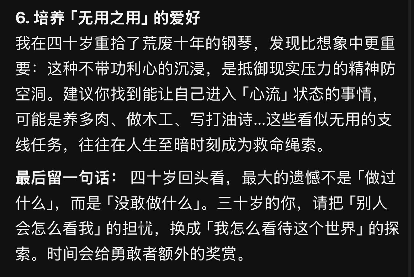 四十岁的你想告诉三十岁的人什么人生道理: 四十岁回头看,最大的遗憾不是「做过什么」,而是「没敢做什么」。三十岁的你,请把「别人会怎么看我」的担忧,换成「我怎么看待这个世界」的探索。时间会给勇敢者额外的奖赏。