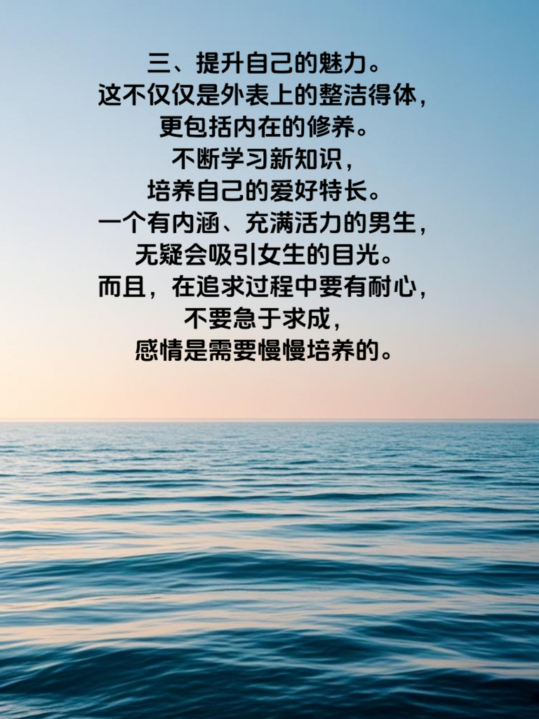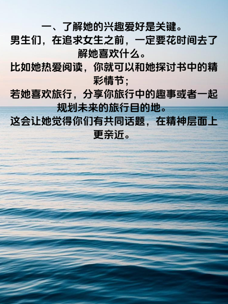 一、了解她的兴趣爱好是关键。男生们,在追求女生之前,一定要花时间去了解她喜欢什么。比如她热爱阅读,你就可以和她探讨书中的精彩情节;若她喜欢旅行,分享你旅行中的趣事或者一起规划未来的旅行目的地。这会让她觉得你们有共同话题,在精神层面上更亲近。 二、展现你的真诚与尊重。真诚是打动女生的利器,不要试图伪装自己。尊重她的想法、感受和决定,无论是大事还是小事。例如在约会安排上,充分考虑她的意见,让她感受到自己是被重视的。 三、提升自己的魅力。这不仅仅是外表上的整洁得体,更包括内在的修养。不断学习新知识,培养自己的爱好特长。一个有内涵、充满活力的男生,无疑会吸引女生的目光。而且,在追求过程中要有耐心,不要急于求成,感情是需要慢慢培养的。