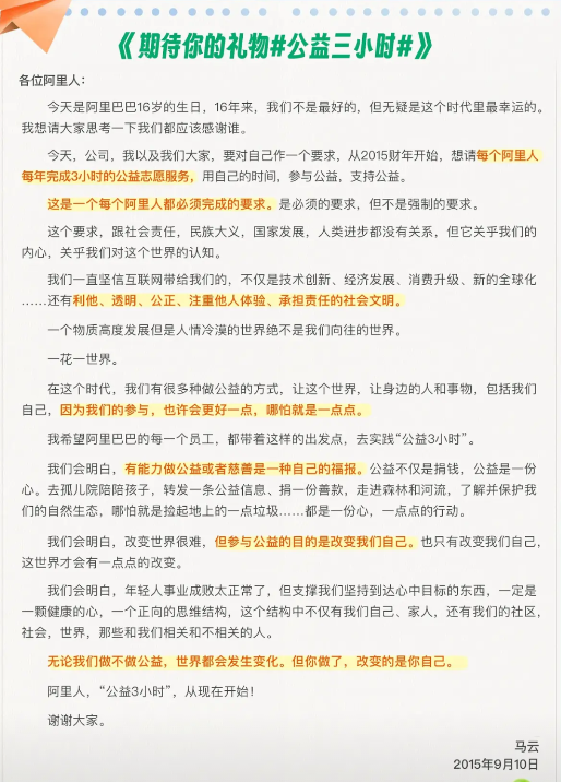 2015年,马云作为阿里巴巴一号志愿者,给阿里所有员工发了一封信,提出“人人3小时”公益,并且在第二年就开展“阿里巴巴公益榜”评选,以此来激励阿里员工投身公益事业。