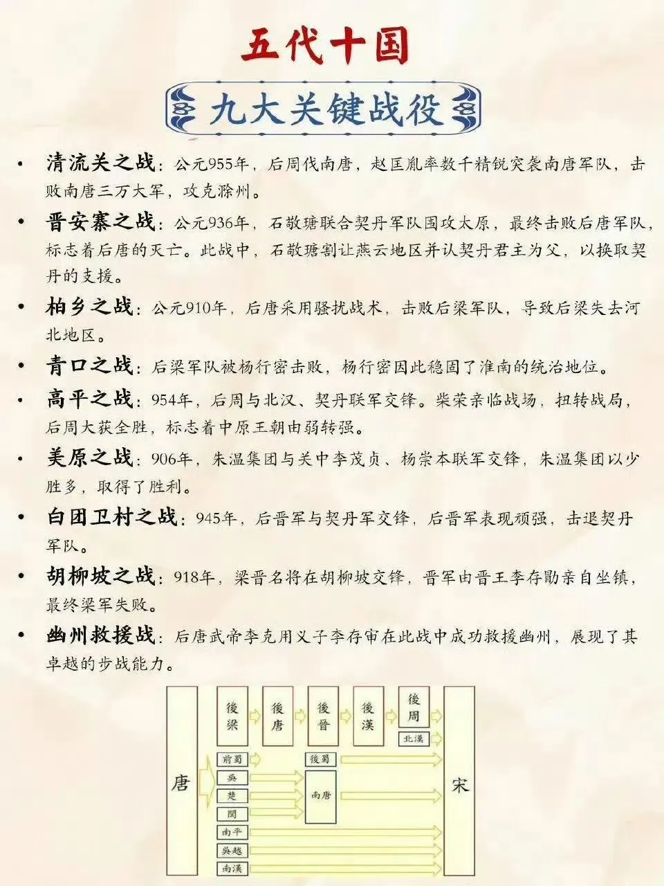 从907年到979年,上承唐下启宋。 中原先后有后梁、后唐、后晋、后汉、后周这五个政权。后梁由朱全忠建立,他废唐哀帝后称帝。后唐李存勖又灭了后梁。后晋的石敬瑭靠契丹扶持称帝,还割让燕云十六州,这对中原防御影响巨大。后汉、后周也在不断的政权更迭中。 同时南方和河东有十个割据政权。这期间战争不断,百姓生活困苦。各个政权为了争夺地盘和权力,互相攻伐。不过这时期文化也有一定发展,比如词在这一时期开始兴起,为后来宋词的繁荣奠定了基础。