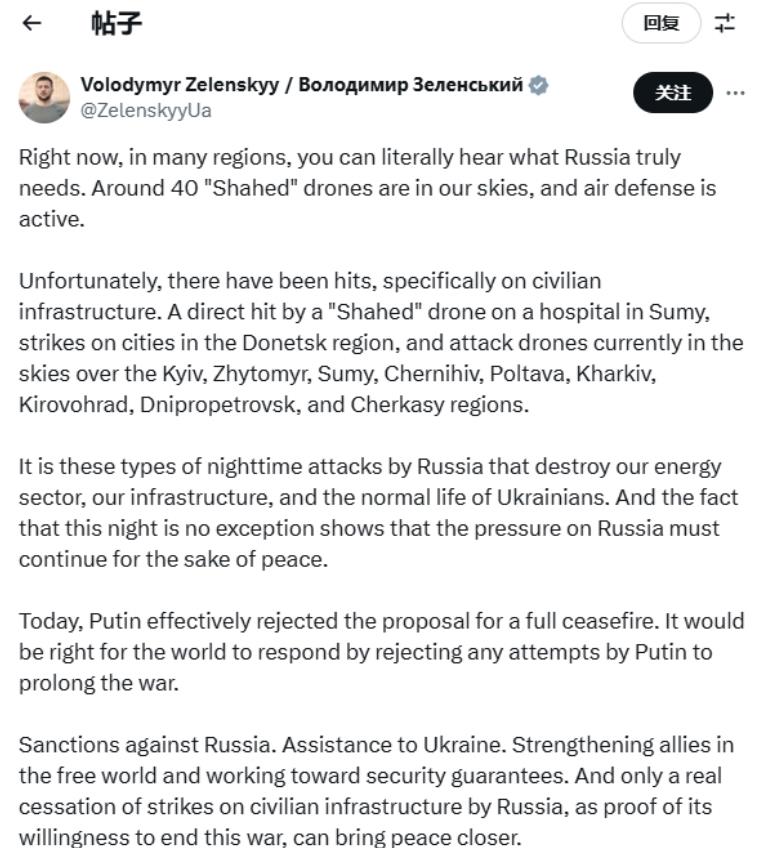 泽连斯基“哭诉”:不是说好停火,怎么俄罗斯还在轰炸 事实证明,特朗普所谓的“普京已经同意停止袭击乌克兰能源基础设施”,只是普京糊弄特朗普的文字游戏。 19日泽连斯基在社交媒体上表示,当天俄军仍对乌克兰苏梅、基辅、切尔尼戈夫、波尔塔瓦和哈尔科夫等多地的基础设施发动空袭,俄军大概发射了145架无人机和2枚弹道导弹,其中有72无人机被乌军击落。 这场袭击发生在普京和特朗普通话之后,泽连斯基借此指责俄罗斯根本没有停火的意愿,不过俄罗斯方面也有说法。 同一时间,俄国防部发布通报称,19日乌克兰向俄罗斯边境地区发射了大量无人机。尽管其中57架无人机被俄军击落,但俄克拉斯诺达尔地区一处油库仍被无人机击中并燃起大火。 俄乌此轮交火证明,在美俄乌三方互信难以建立的情况下,特朗普口头上要求的停火根本不可能实现,普京所谓的“答应停火”不过是说两句好听话哄特朗普罢了。