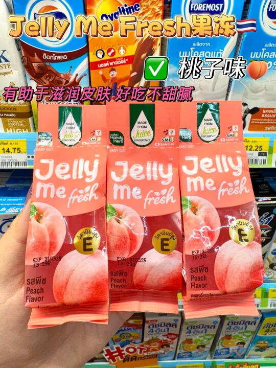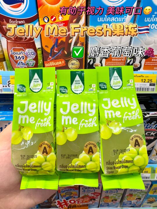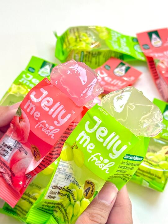 在泰国711冷藏柜看到这个新品一定要拿!就是这个Jelly Me Fresh的果冻☺️粉色是桃子味🍑超级清爽解腻!冰凉爽口还补充维生素E真的太舒服了! 绿色是麝香葡萄🍇酸甜的口感真的让人一口惊艳!里面有维生素A还可以保护我们的眼睛哦👀真的是想让人无限回购! 吃起来也很方便!左右两侧撕一下就可以吃啦!19🐷一包真的划算哭了!今天去周末市场晒晕了开一包这个吃真的很爽!清凉又解暑!