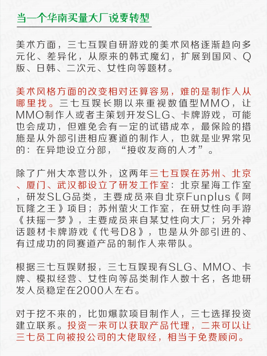 从三七互娱对外投资和新设立的工作室看,三七互娱这几年的自研品类已经从80后大龄男青年热爱的奇迹、传奇MMO,转向多赛道、年轻化的斗罗MMO、卡牌、RPG、SLG、模拟经营,甚至是女性向、二次元。油腻大叔越活越年轻了。