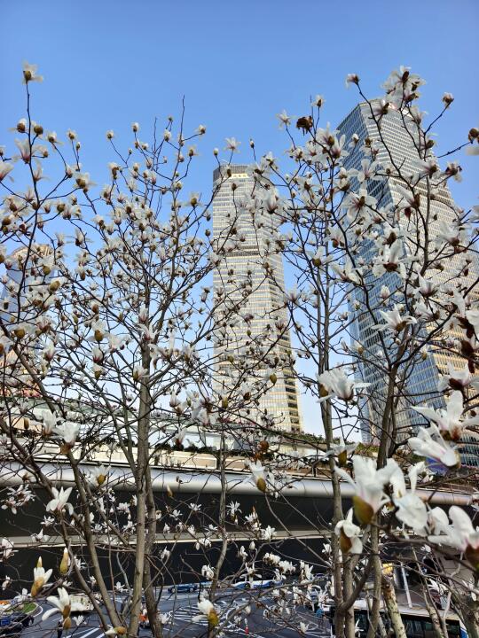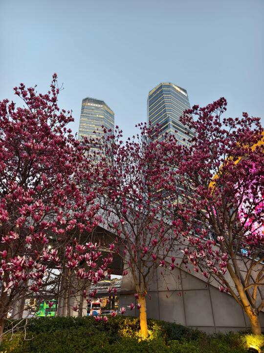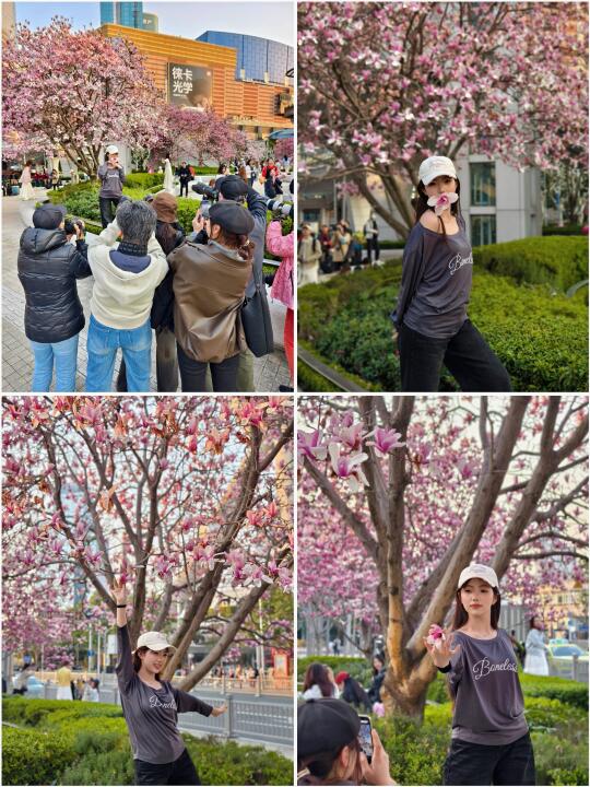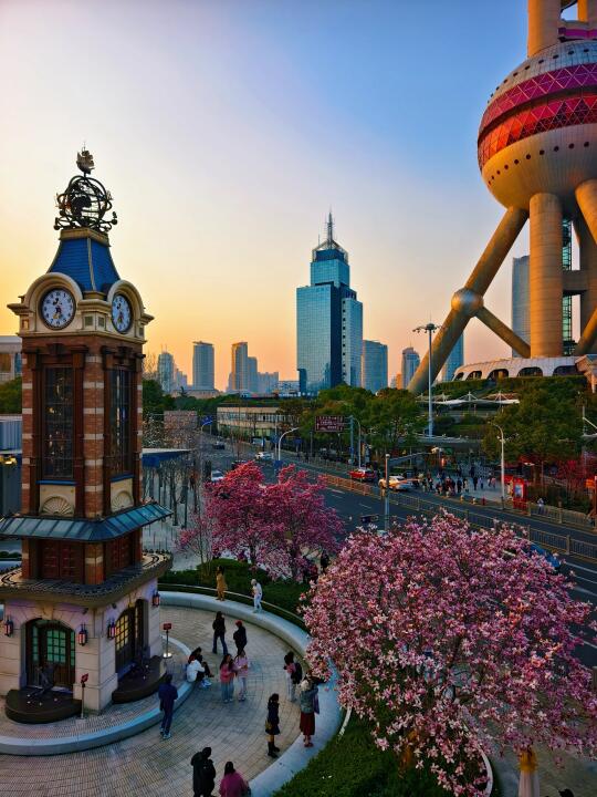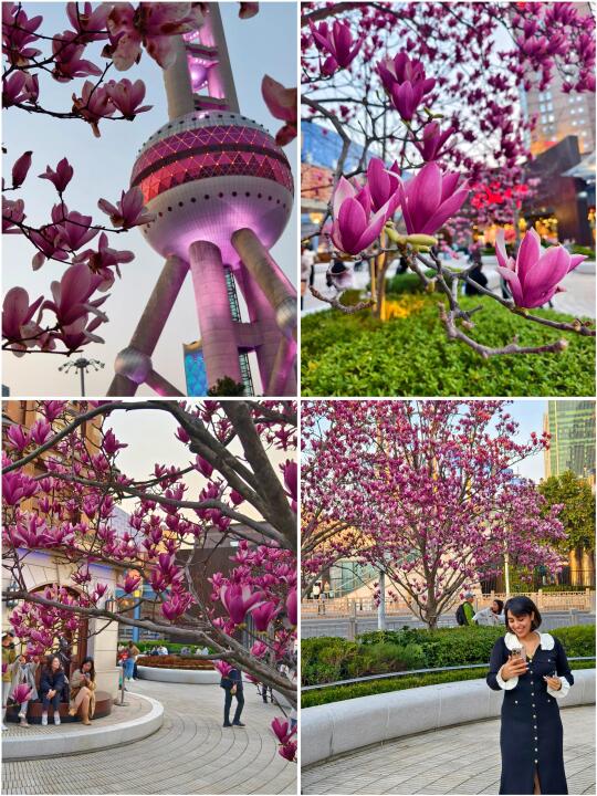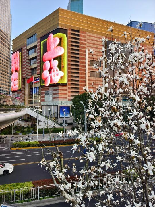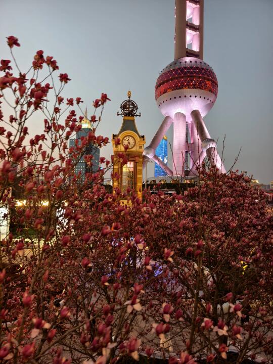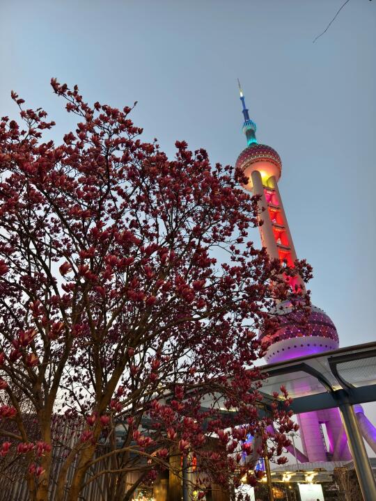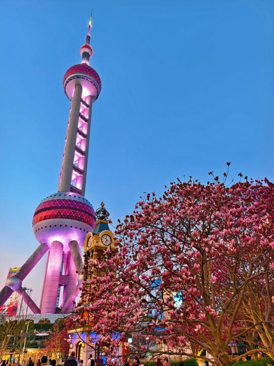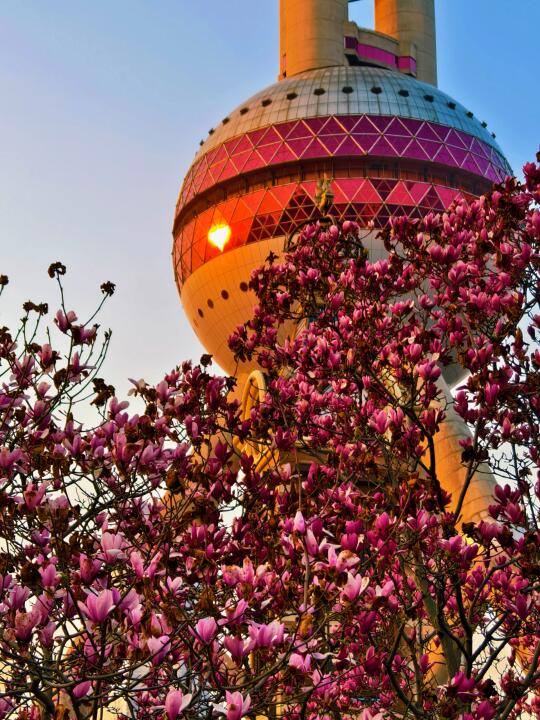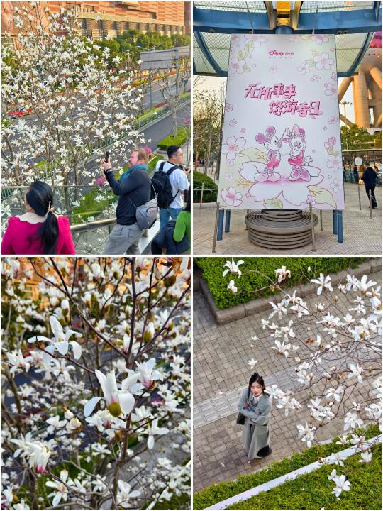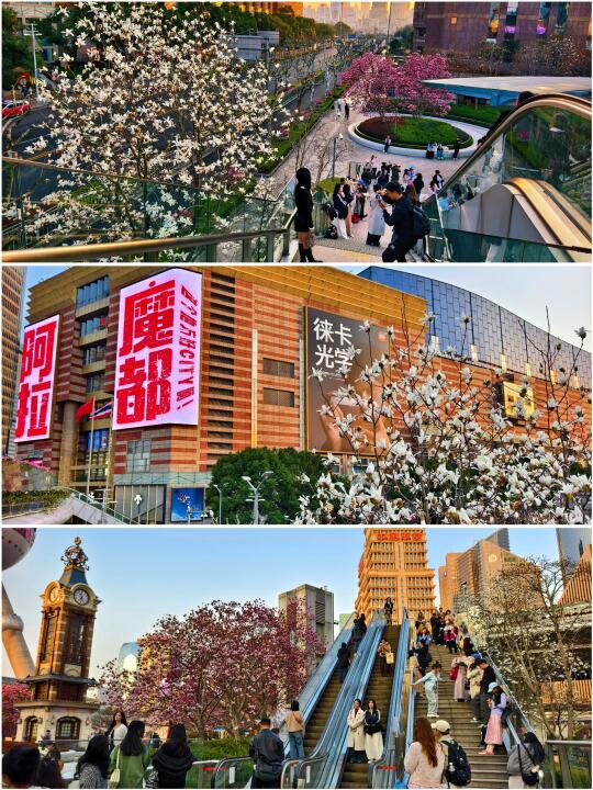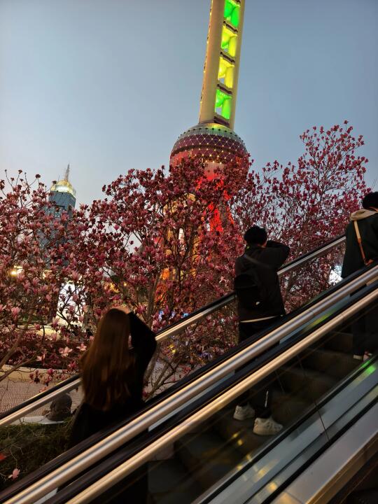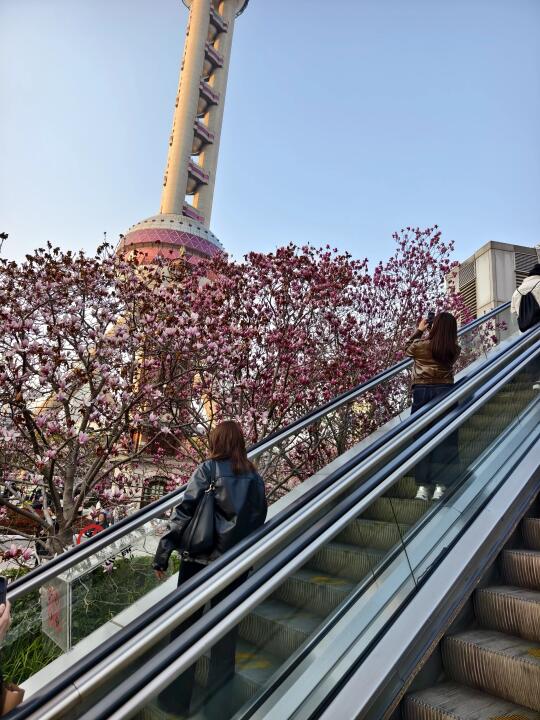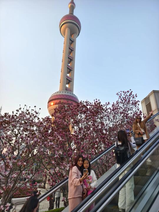 🔥东方明珠附近的迪斯尼旗舰店,有几棵白玉兰、紫玉兰开得正盛,行人路过都会停下来拍几张,包括在自动扶梯上,也有不少人拍照。 🔥东方明珠最大的球体上,出现了一颗爱心,你知道是咋回事吗?