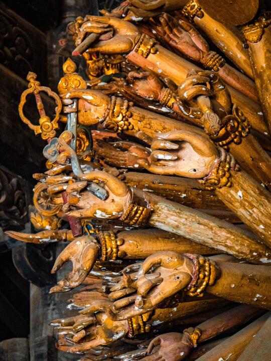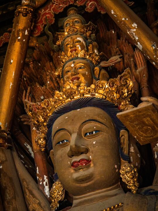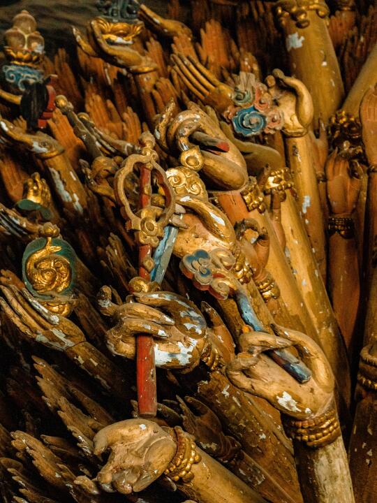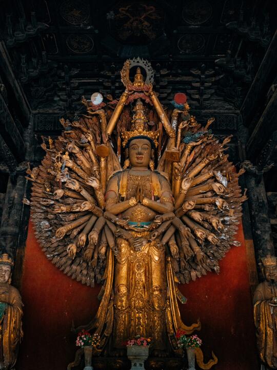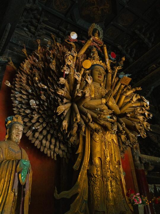 殿内千手观音像由一根整木雕成,千手千眼,神态慈祥,每只手中都持有不同的法器,令人叹为观止。