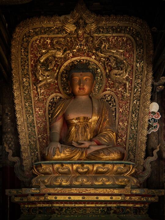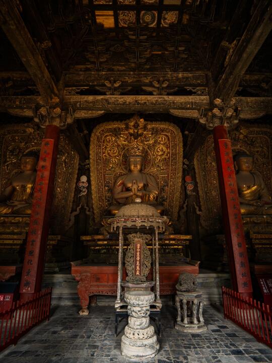 这是报恩寺的核心建筑,殿内供奉着三世佛,四周墙壁上的明代壁画色彩绚丽,保存完好,内容丰富,具有极高的艺术价值。