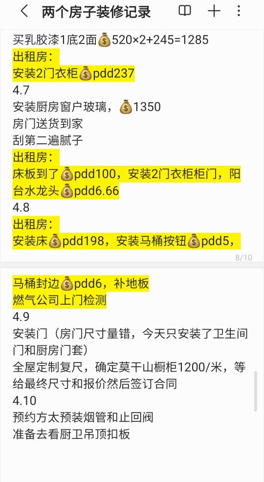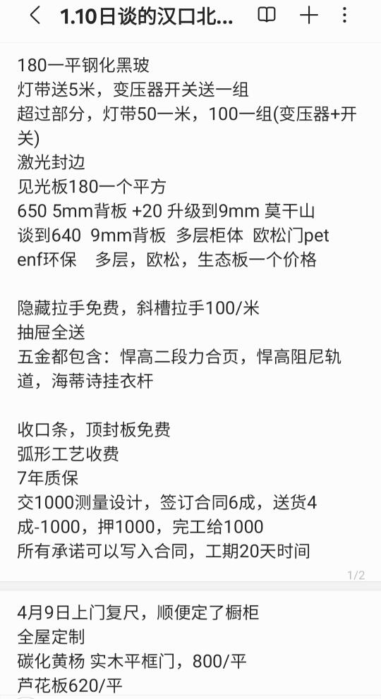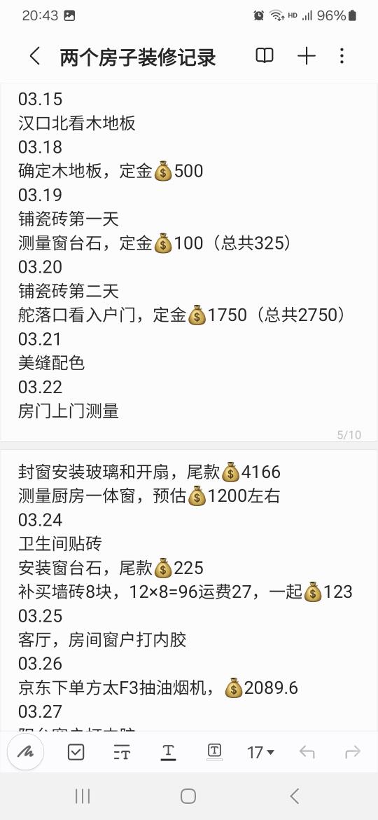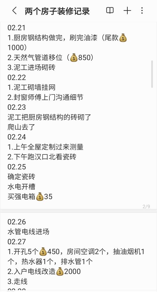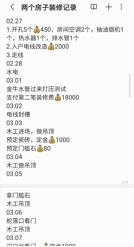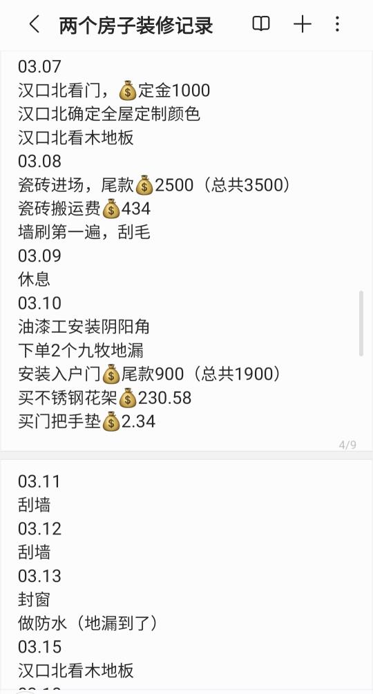 最近先把自己记录的装修流水分享一波,因为年底才回国,目前没上班,所以可以有大把时间跑汉口北,舵落口去比价,逛了好多店,尽量追求极致性价比!自己完整记录了开始装修后每天的内容,可以给以后要装修的宝子们大脑里注入一个大概的流程图,我家半包,目前装修了一个月20天左右吧,从全屋墙壁拆除,重新砌墙,厨房外扩拆除,重新做钢结构外扩,拆窗户,开槽走水电,到现在瓷砖铺了,封窗结束,自流平做了,入户门换了,刮了2道腻子,今天安装房门,全屋定制过来复尺,本来就只等刷乳胶漆,铺木地板,全屋定制进场,安装厨卫吊顶和开关面板,灯具,结束🔚