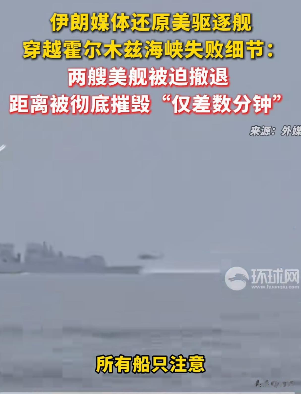 在听到伊朗方面的警告之后,两艘美军战舰眼见无法通航,迅速调整方向,被迫从霍尔木兹海峡撤离。