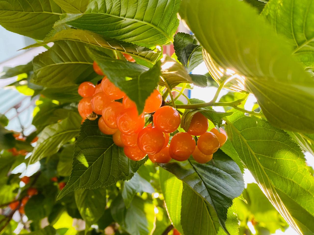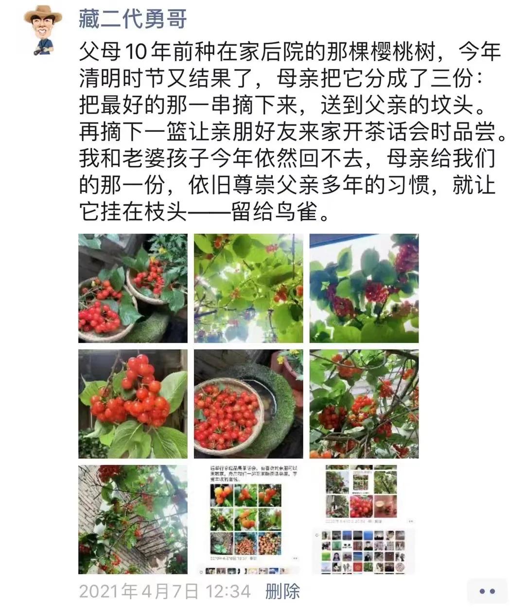 又到家里樱桃成熟的季节了。 采摘一篮,预备连夜驱车几百公里,分别去送给何老师和儿子品尝——由于时间关系和工作原因,挂果十几年来,他俩连一次都没尝到过家里樱桃的味道。 即使还没完全成熟,但惦念的远送依然充满甜蜜。 父母10年前种在家后院的那棵樱桃树,今年清明时节又结果了,母亲把它分成了三份:把最好的那一串摘下来,送到父亲的坟头。再摘下一篮让亲朋好友来家开茶话会时品尝。 我和老婆孩子今年依然回不去,母亲给我们的那一份,依旧尊崇父亲多年的习惯,就让它挂在枝头——留给鸟雀。