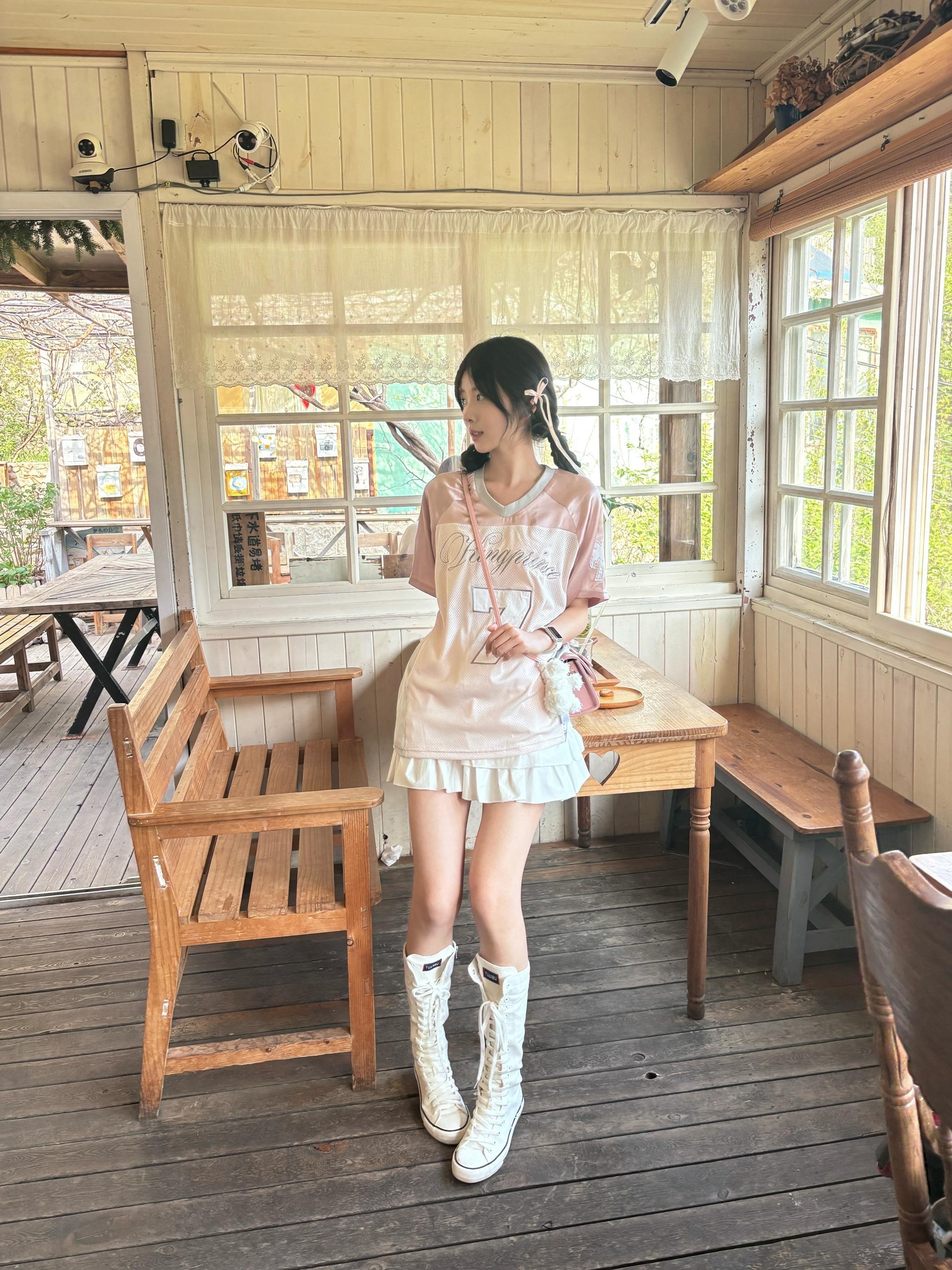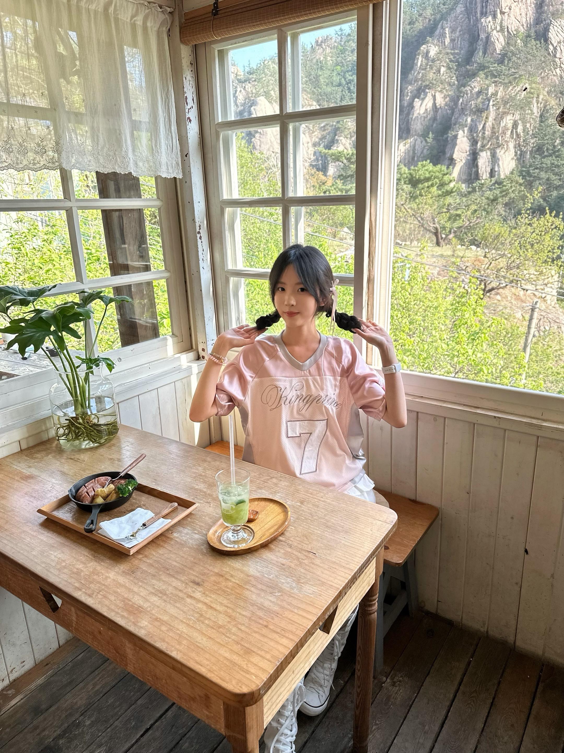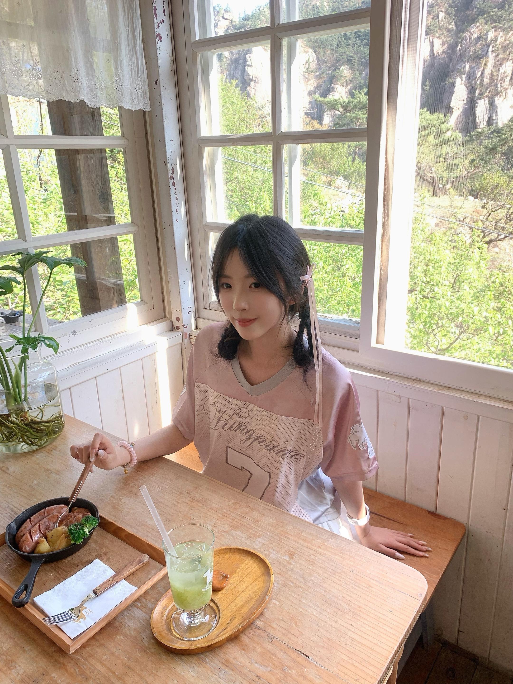 一位长相漂亮、身材出众的姑娘,穿上了一件对身材要求极高的紧身款一字肩粉色针织衫搭