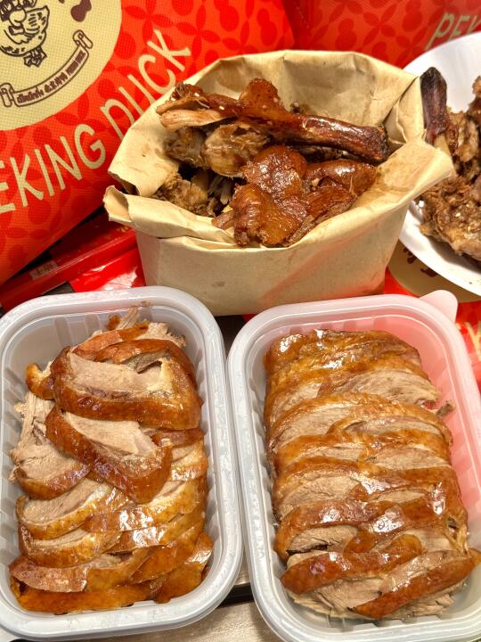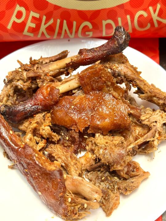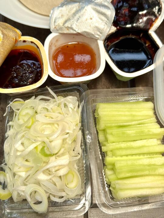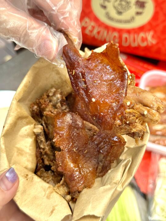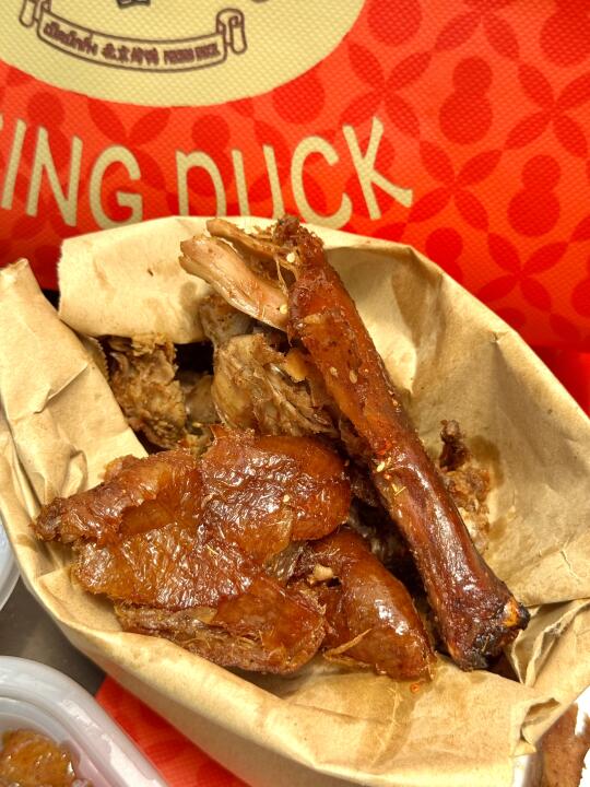 Grab点单送来还是热热的🔥烤得金黄透亮的烤鸭搭配着大葱➕甜面酱➕黄瓜🥒一口咬下去真的香迷糊了😧据说他家厨师是在北京烤鸭做了10几年的老师傅👏所以做出来的烤鸭特别美味😋它家的鸭架也是灵魂搭配😎椒盐味和香辣味都好好吃‼️边追剧边吃我一个人都吃完了一整份😋