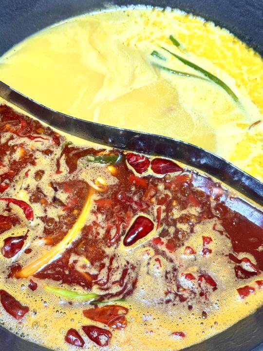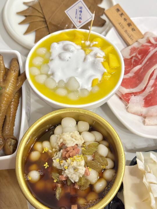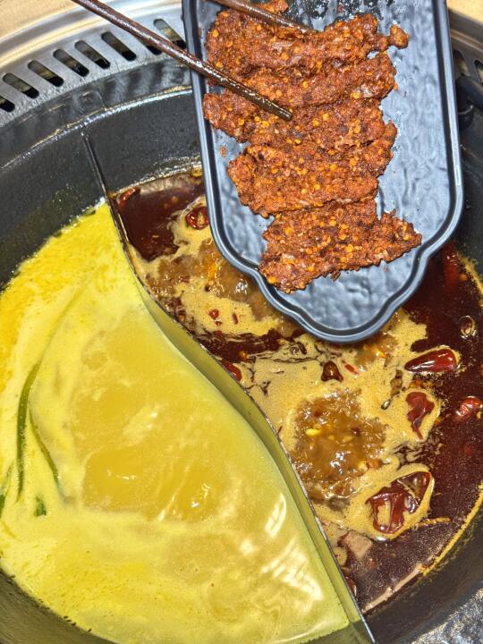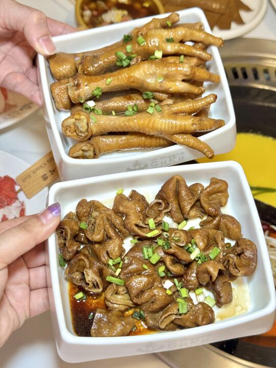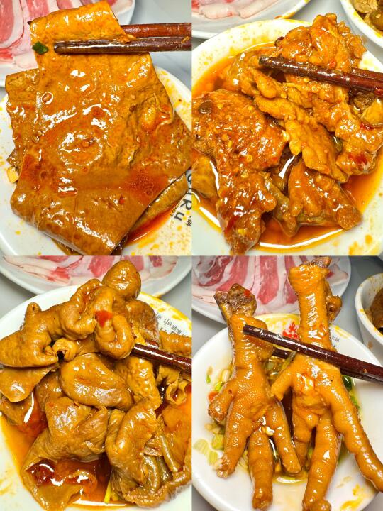 锅底是超级醇正的重庆味道 又香又麻又辣真的停不下来!(不是那种加了很多水舍不得放底料的锅底!一吃就知道老板是下了血本的👏)菜品也是重庆特色黄喉‼️毛肚‼️鸭肠等鲜货通通都有‼️还有我最爱的卤肥肠和耙鸡脚🐔卤菜我一个人都可以吃两份哈哈 你们就知道有多好吃了!它家花胶鸡锅底也很巴适‼️光喝汤就知道老板是用心熬制的!可以吃到最后捞个饭更完美😍