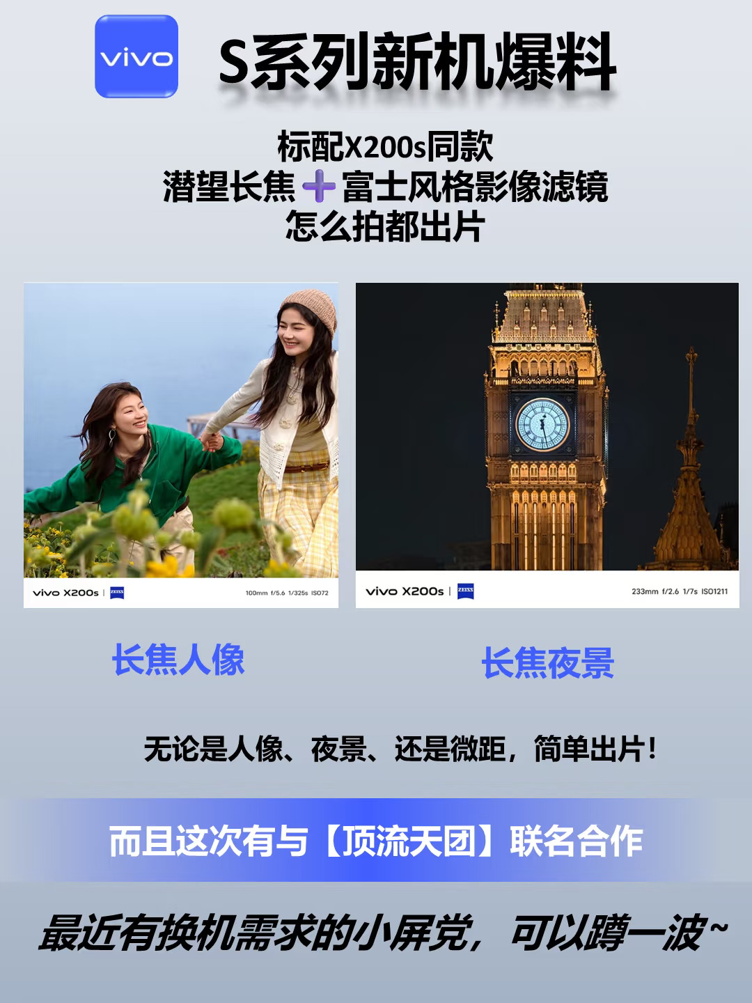 [害羞R]喜欢小屏手机的用户可千万不要错过,因为vivo S30系列这个月就要发布了! 先说vivo S30 Pro mini,作为蓝厂S系列里面的小直屏,屏幕尺寸很mini,才6.31英寸。但配置和续航可都是pro级别的,6500mAh超大蓝海电池、高性能旗舰芯片、IMX882潜望长焦....... 另外还有超好看的金属中框和多彩配色,能给的都给到了,再说标准版vivo S30,也是标配6500mAh大电池,6.67英寸也能兼顾喜欢大屏的用户,一如既往的超轻薄,高颜值。 哦对了,vivo S30系列还全系标配X200s同款潜望长焦➕富士风格影像滤镜,vivo这是要做旗舰的节奏啊。 🙋‍♂个人建议:最近有换机需求的小屏党,可以蹲一波~