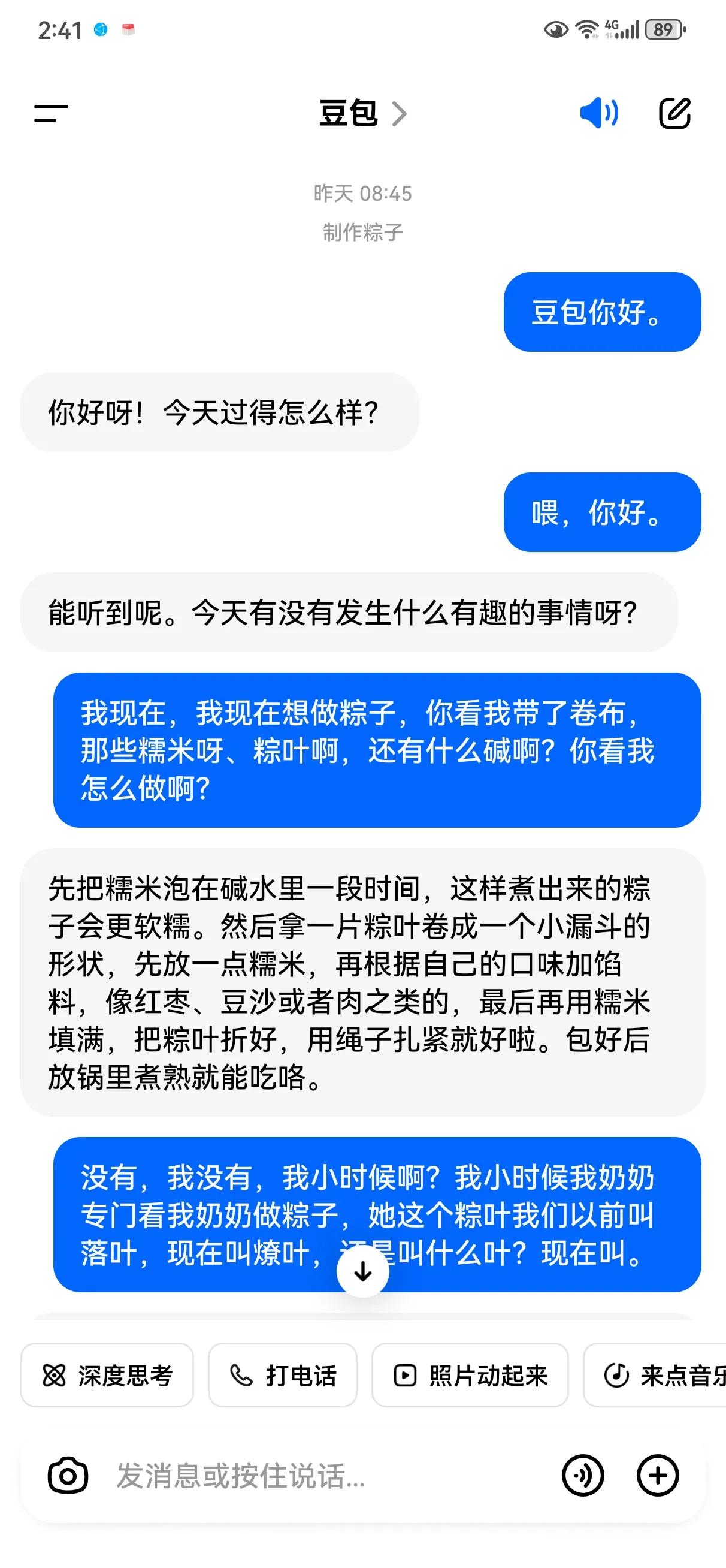早两天给豆包打电话,告知它端午节快到了。回想起小时候,每年端午节奶奶都会在家包粽子,如今忆起仍觉得格外温馨。 记得小时候,每逢传统节日来临之前,我奶奶总是忙个不停,备好时令节日美食供全家人享用,节日氛围甚是浓郁。 然而,由于当时物资供应极为紧张,主要的食品、布料都是供给制,所以筹备原材料就略显繁杂。 就拿端午节来说,奶奶会去菜市场买粽子叶,我们老家方言称其为“寮叶”,大概就是如今的“箬叶”,还要买豆子,再到粮站买糯米。每到端午节前夕,粮站会按人口配给糯米。 备好这些材料后,奶奶就在家忙开了,将米、豆子等用水浸泡,然后坐下来逐个包粽子。我也常常在一旁看着奶奶包,自己也试着包,却总是掌握不了诀窍,只能等奶奶把包好的粽子煮熟,便可大饱口福了。 但在我刚上初中的时候,奶奶因病离世,从那以后家里就再也没包过粽子。每年端午节要么不吃粽子,要么就买粽子吃。参加工作后,单位每年端午节都会发粽子。 如今退休了,不知为何,老是回忆起小时候奶奶包粽子的情形,特别想自己包粽子吃。可思来想去,自己包粽子还是不得要领,只好向豆包求助了。 马上给豆包打电话,豆包用极为温柔的声音告诉了我包粽子的所有细节,还反复提醒我各种注意事项。 依照豆包的指导,我第一次自己包的粽子,不但外观漂亮,老婆还由衷地说:好吃! 这不,这两天我们在家实现粽子自由了,嘿嘿。昨天老婆又在网上下单了粽叶,糯米等……