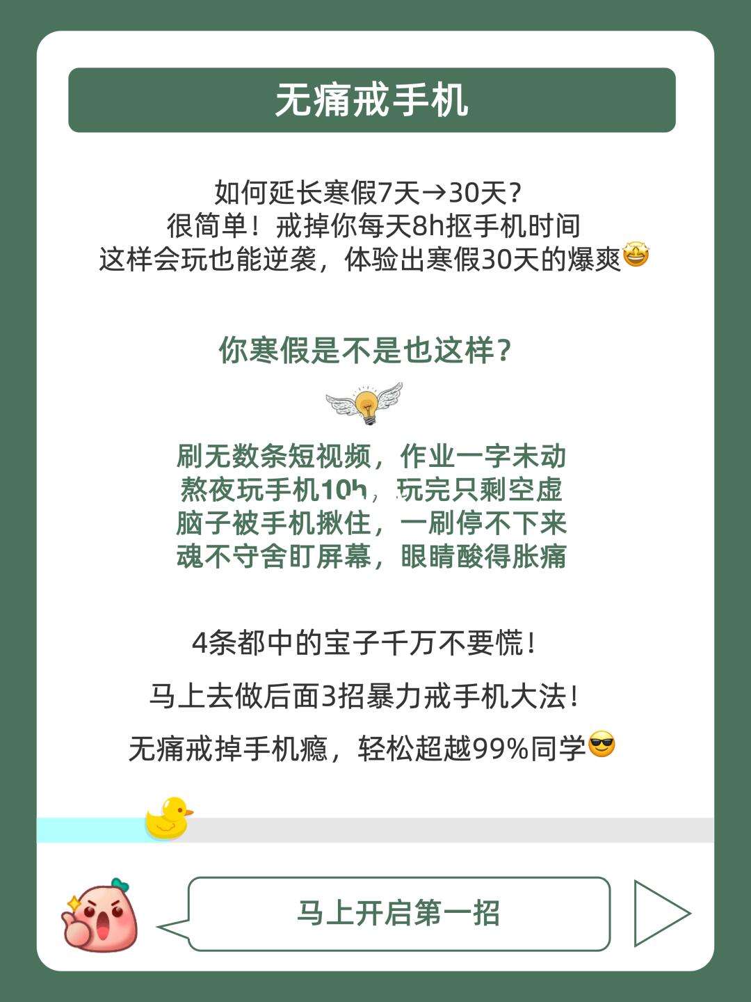 [赞R]寒假摆烂不用怕,鸭鸭带你戒手机❗️ · [赞R]轻松戒掉手机瘾,寒假自律逆袭弯道超车🚀 . 🐣我是鸭鸭学长,持续分享更多自律方法,陪宝子们学习开窍,考试开挂!💯