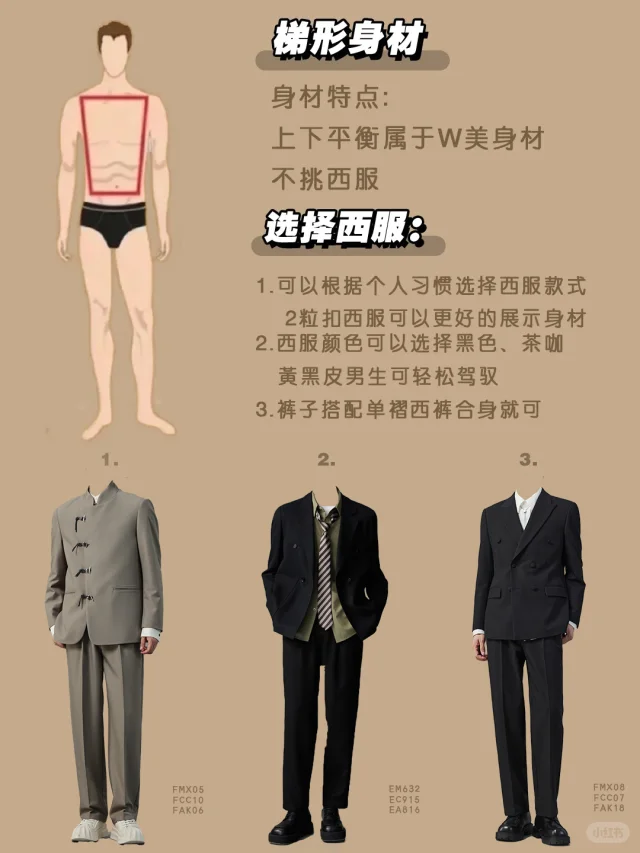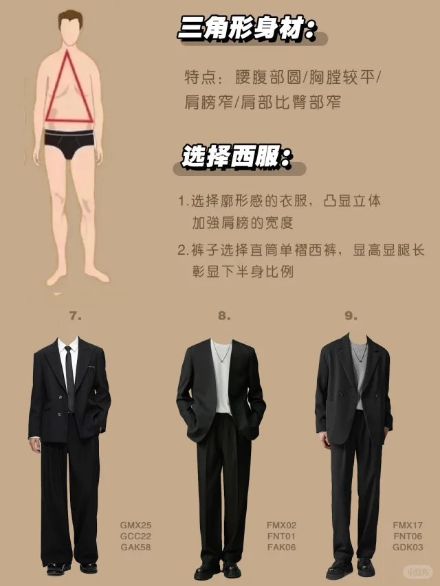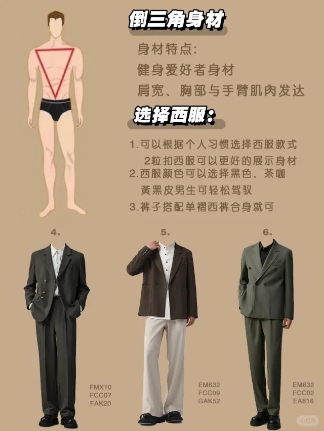 ✅倒三角身材: 🚩4:整体上宽下窄,西服也可以选择宽肩窄腰的西服,套装质感一样更高级,搭配白色衬衫复古气质又先品味和身材