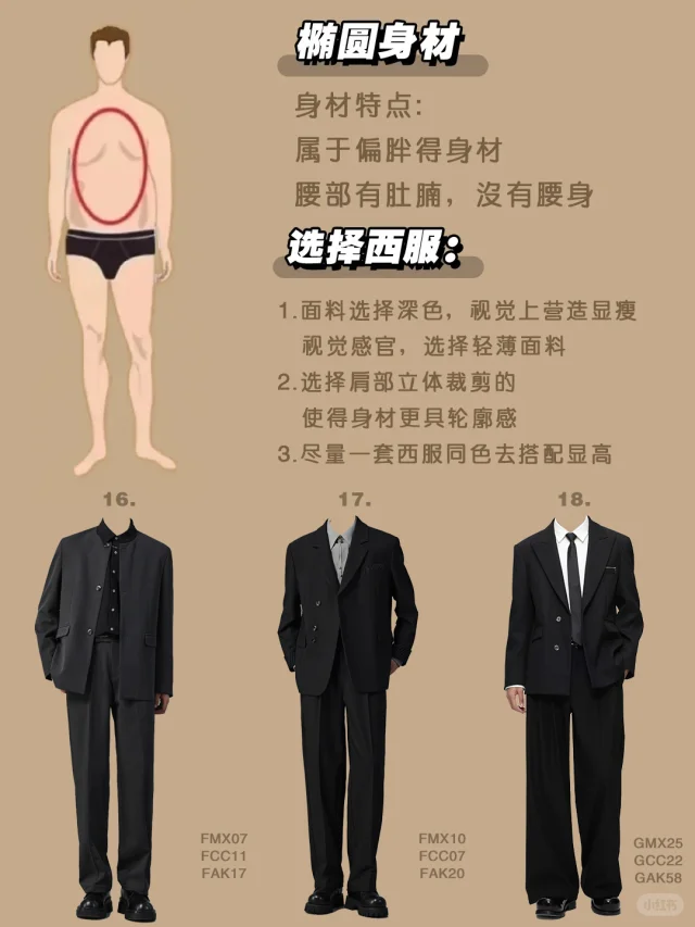 选择西服tips: 🚩16/17/18:选西服避免横向发展,选择轻薄面料或深色系面料,可以选择村衫领口选有小尖领,视觉显瘦,肩部剪裁立体,使得身材更具有轮廓感 ,当然深色系的西服整体更显瘦
