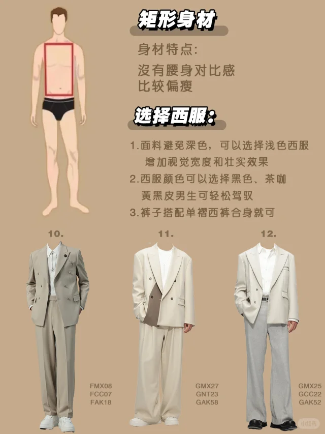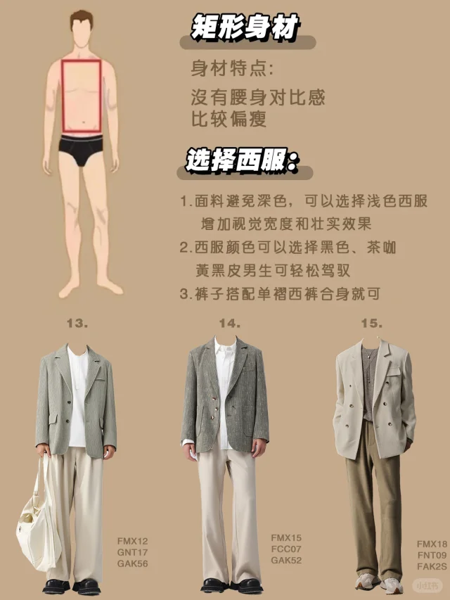 选择西服tips: 🚩13/14/15:矩形身材的男生比较瘦小可以选择浅色的西服,增加视觉的宽度和壮实的感觉