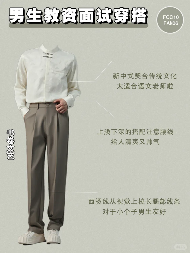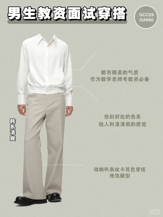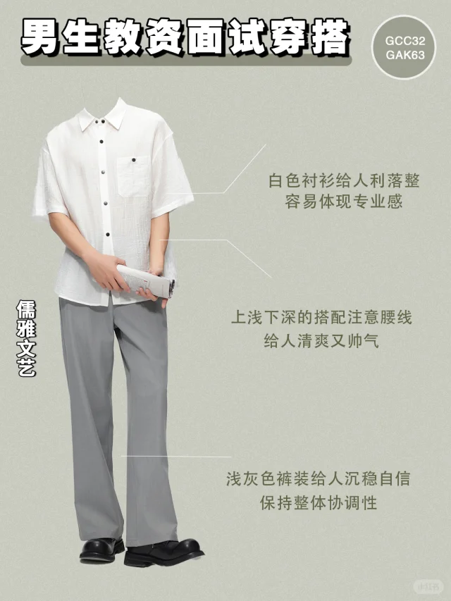 🔸白色衬衫搭配浅灰西裤就很清爽休闲又有亲和力,怎么不讨学生和面试官的喜爱呢