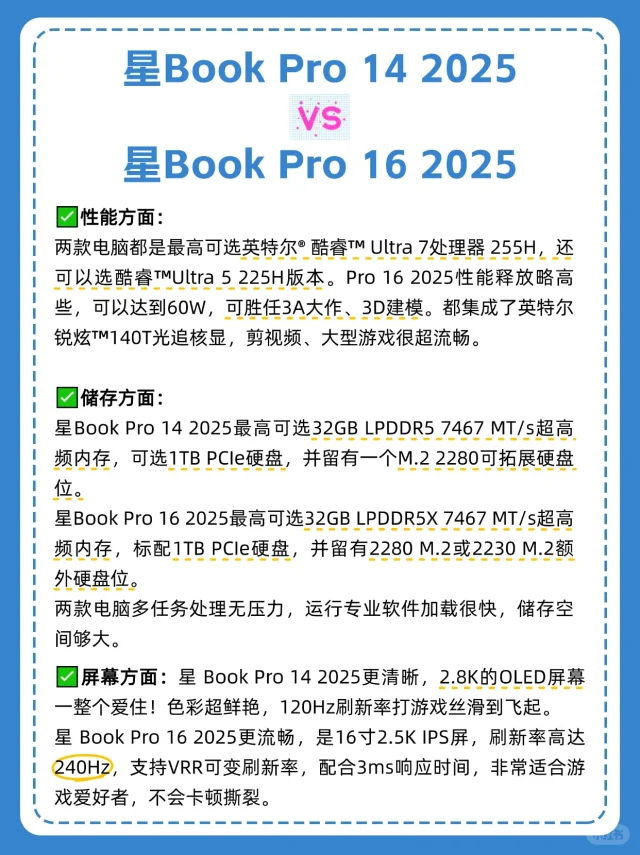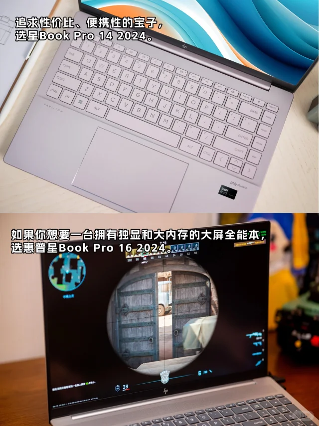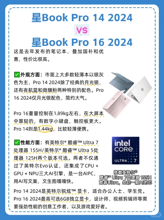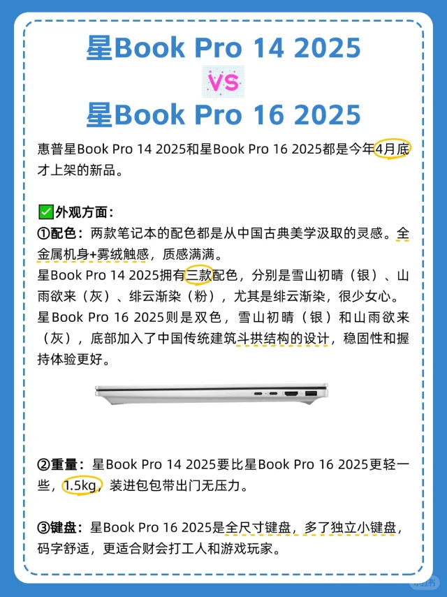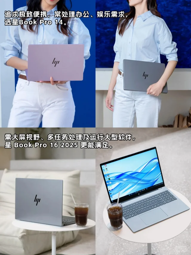 还在纠结 618 换哪款笔记本的宝子们看过来! 惠普星Book Pro系列在屏幕和性能方面都超能打,销量也相当亮眼。今天就来给大家盘一盘这个系列里的四款热门机型,看看哪款是你的“天选本”! 星Book Pro 14 2025 vs星Book Pro 16 2025 ✅外观方面: ①配色: 星Book Pro 14 2025拥有三款配色,尤其是绯云渐染,很少女心。 星Book Pro 16 2025则是双色。底部加入了斗拱设计,稳固性和握持体验更好。 ②重量: 星Book Pro 14 要比星Book Pro 16 2025更轻一些,1.5kg,装进包包带出门无压力。 ③键盘: 星Book Pro 16 和14比多了独立小键盘,更适合财会打工人和游戏玩家。 ✅性能方面: 两款电脑最高可选英特尔® 酷睿™ Ultra 7处理器 255H,还可以选英特尔® 酷睿™ Ultra 5 处理器225H版本,性能更强大,可胜任3A大作、3D建模。 ✅AI方面: 两款电脑内置的惠小微AI助手都升级到了5.1版本,集成了AI智慧中枢+AI办公助理+AI电脑管家。 总结:追求极致便携,常处理办公、娱乐需求,选星Book Pro 14。 需大屏视野、多任务处理及运行大型软件,星Book Pro 16更能满足。 星Book Pro 14 2024 vs星Book Pro 16 2024 ✅外观方面: Pro 16 2024拥有经典月光银配色,简约大气。Pro 14 2024除了银色外,还有夜航蓝和微醺粉两种特别的配色。 Pro 16重量控制在1.89kg左右,在大屏本中算轻的,有数字小键盘,触控板更大。Pro 14则是1.44kg,比较轻薄便携。 ✅性能方面: 两者配置差不多,都最高搭载英特尔® 酷睿™ Ultra 7处理器 155H,不仅通过了英特尔Evo认证,还集成了CPU + GPU + NPU三大AI引擎,是一台AIPC,用AI写文案,文生图嘎嘎快。 Pro 16 2024最高可选6GB独立显卡,适合需要强劲性能的创意工作者,以及游戏爱好者。 总结:追求性价比、便携性的宝子,选星Book Pro 14 2024。而如果你想要一台拥有独显和大内存的大屏全能本,选惠普星Book Pro 16 2024。