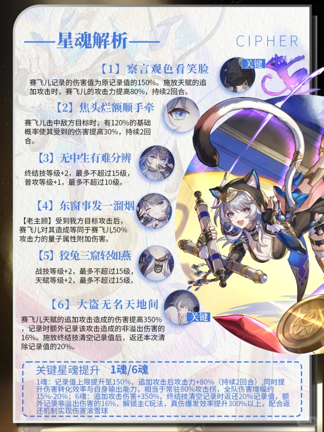 【1】察言观色看笑脸赛飞儿记录的伤害值为原记录值的150%。施放天赋的追加攻击时,赛飞儿的攻击力提高80%,持续2回合。