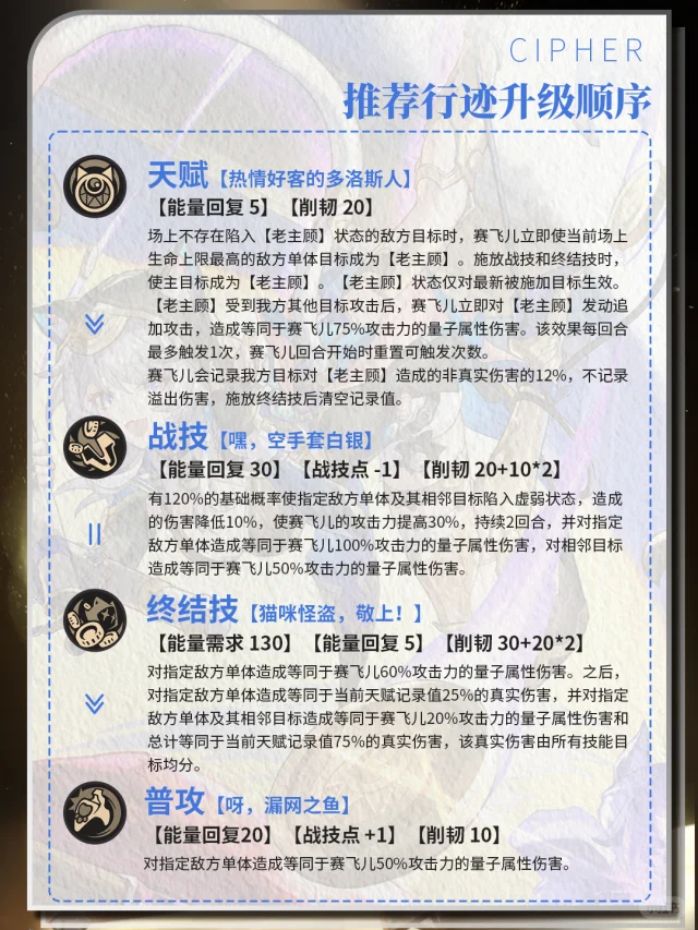 对指定敌方单体造成等同于赛飞儿60%攻击力的量子属性伤害。之后,对指定敌方单体造成等同于当前天赋记录值25%的真实伤害,并对指定敌方单体及其相邻目标造成等同于赛飞儿20%攻击力的量子属性伤害和总计等同于当前天赋记录值75%的真实伤害,该真实伤害由所有技能目标均分。