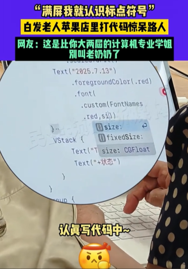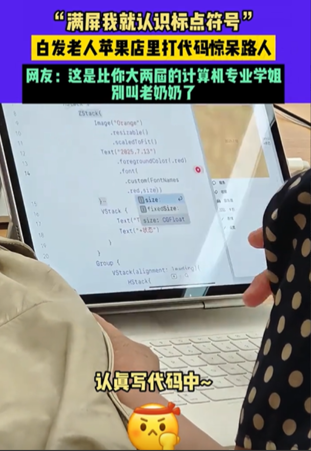 “完全没法解释!”7月11日天津,女子逛苹果店时,竟然发现一个老奶奶,正在电脑上敲代码!看她的模样,对代码非常的熟练,这番操作直接惊呆了路人,要知道,就这些代码,年轻人都很少有人看得懂,网友:这是比你大两届的计算机专业学姐,别叫老奶奶了!