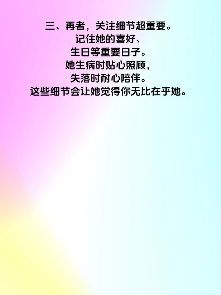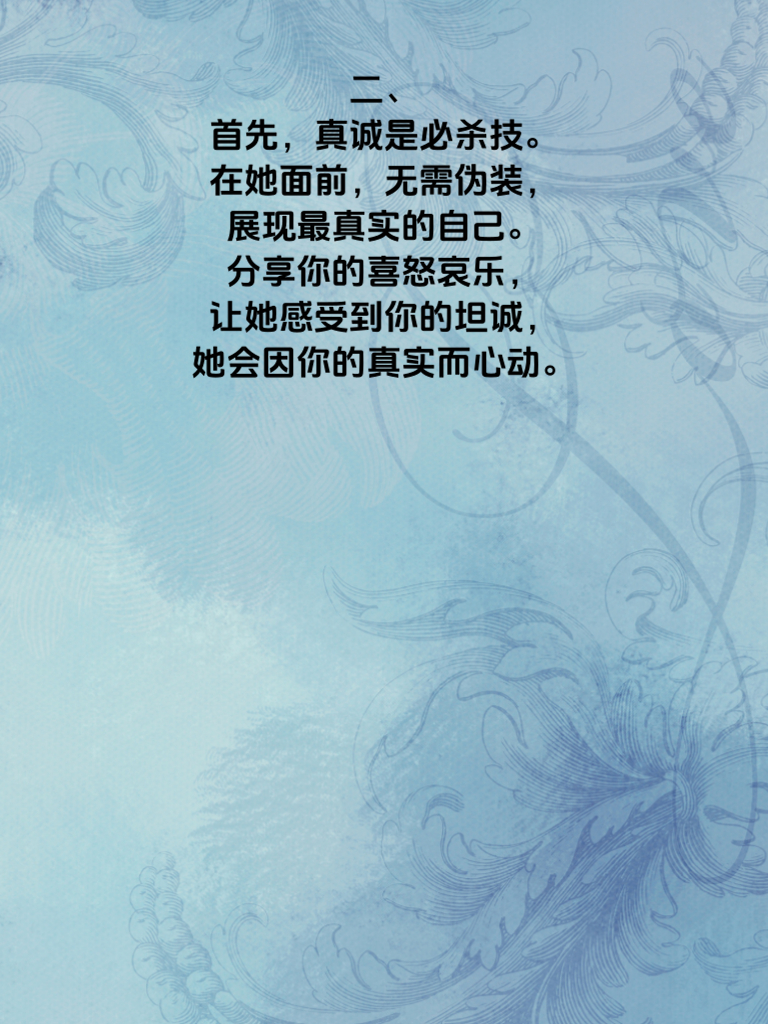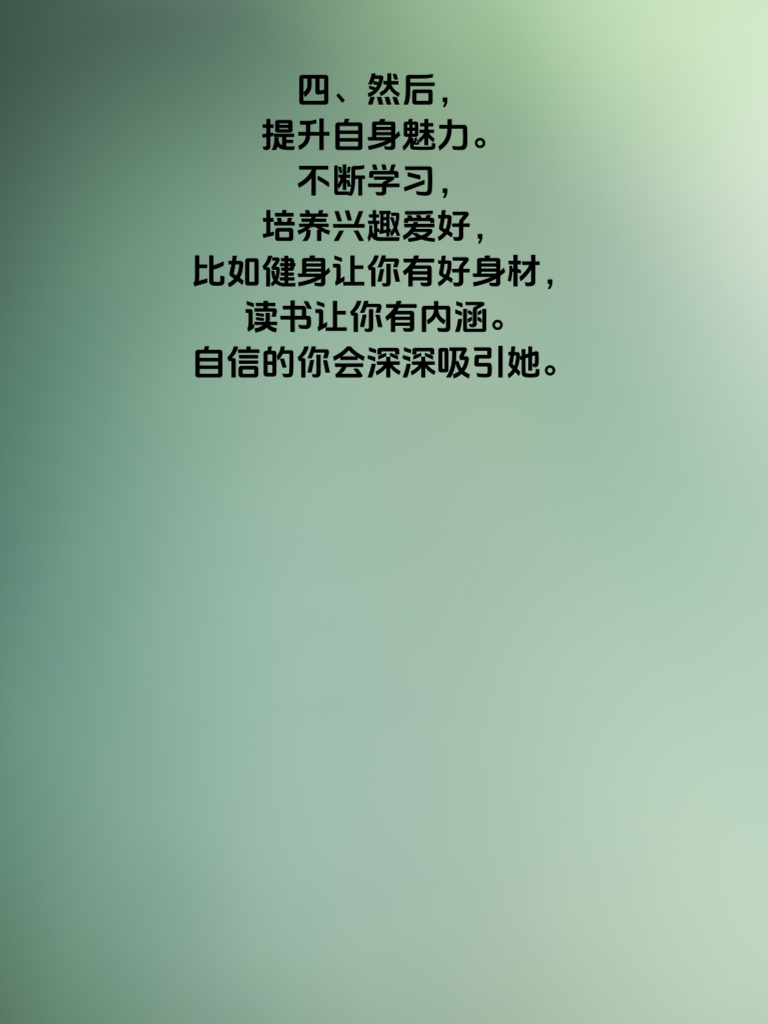 一、想成为她心中的男神吗?掌握这4个技巧,让你轻松脱颖而出! 二、首先,真诚是必杀技。在她面前,无需伪装,展现最真实的自己。分享你的喜怒哀乐,让她感受到你的坦诚,她会因你的真实而心动。 三、再者,关注细节超重要。记住她的喜好、生日等重要日子。她生病时贴心照顾,失落时耐心陪伴。这些细节会让她觉得你无比在乎她。 四、然后,提升自身魅力。不断学习,培养兴趣爱好,比如健身让你有好身材,读书让你有内涵。自信的你会深深吸引她。 五、最后,保持适当神秘感。别一股脑把自己全交代了,偶尔展现新的一面,让她对你充满好奇,想要不断去探索你这个宝藏男孩。做到这些,你就能成为她独一无二的男神啦!