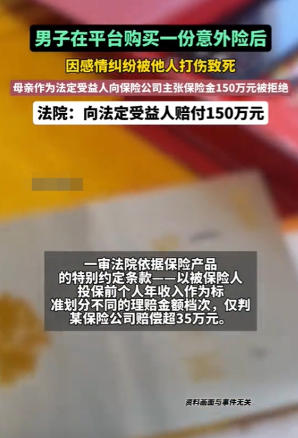 7月3日北京,一男子曾花高价买了个150万的意外险,可没多久男子就因为情感纠葛被打伤致死。母亲悲痛之余找保险公司赔付,可保险公司直接拒绝了,原因是觉得男子骗保,不然怎么会刚买完保险人就没了。在多次协商无果后,男子母亲无奈将保险公司告上法庭,可一审法院却只判赔35万元。男子母亲不服,提起上诉后,二审法院作出了不同判决。