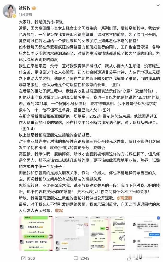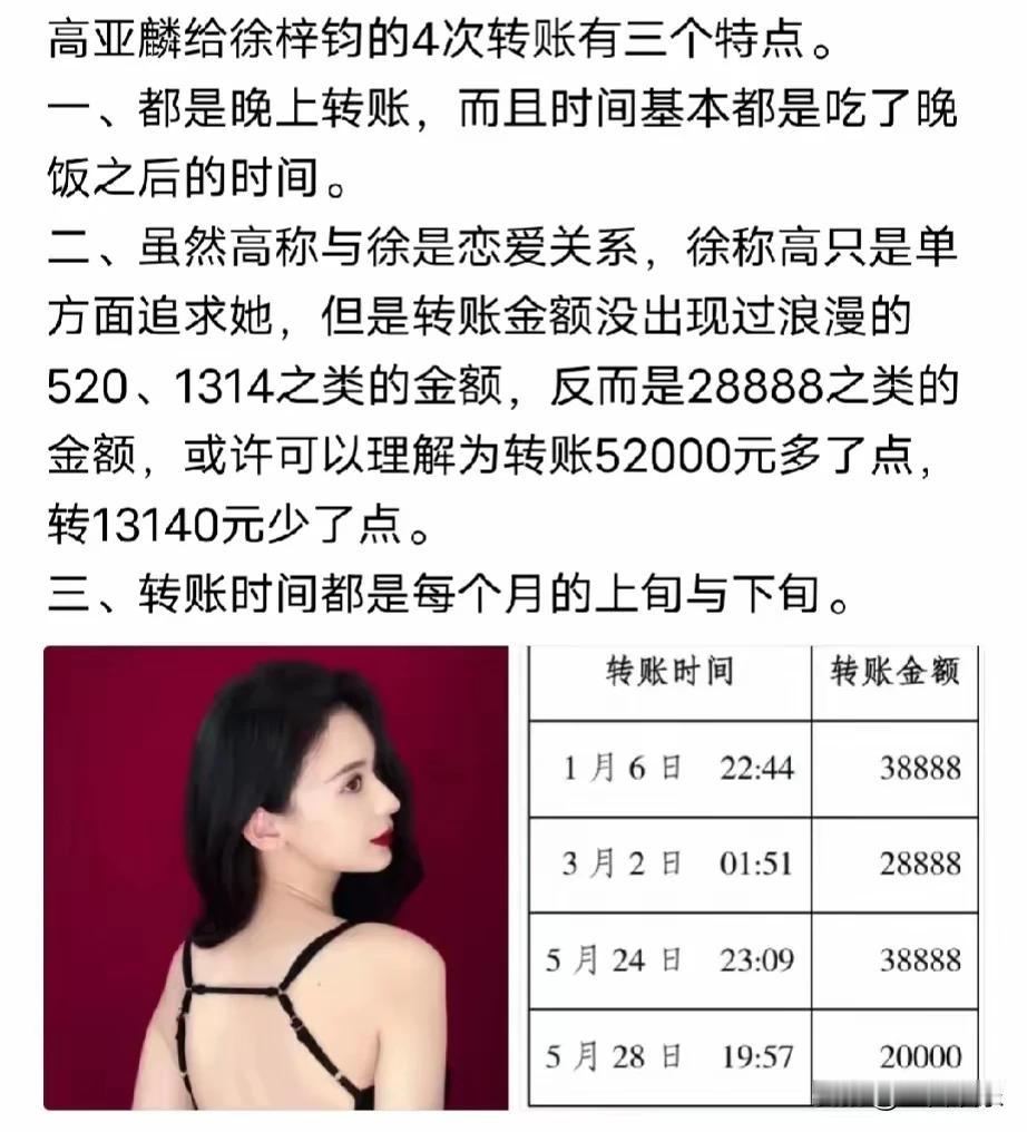 徐梓钧这孩子太不容易了,一个人在北京打拼,连个公关团队都没有! 这文一看就是本人写的,没有人给深度润色加工,太容易给人抓住把柄! 这不,有人开始分析你文中的漏洞了吧! 每月上下旬转账,晚上转账,金额与爱情无关! 如果我分析,还有以下几个漏洞,可以说是自锤: 1.“我确实收到过高亚麟表达示好的心意”,这句话的的意思我收了钱! 后文说“即便我和你曾真的是男女朋友关系”表示我们当时不算男女朋友,不是男女朋友,又收了5位数的钱四次,什么关系,大家自己猜! 2.“我不过是他众多追求对象中的一个”,“我和你之间并没有超脱朋友的情感关系” “你给我转账,不过是你追我,试图与我建立关系的手段”表明你跟他是普通的朋友,但你又收了四次五位数,是否表明你是捞女? 3.“我收下你对我示好的转账,也不代表我接受你的感情,更不代表我和你之间有什么不正当的关系”这好像与谭竹一样,只管收钱,不主动,不拒绝,是否表明你是渣女? 这小作文写的一看就知道智商堪忧,不如给我转五位数,我来操刀