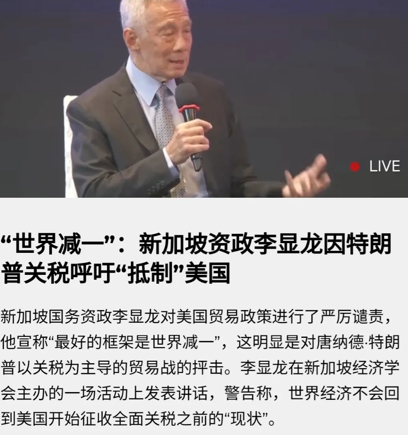 但李显龙也强调,美国不可能肆意妄为,他必须依赖其他国家,也必须依赖中国的稀土。因此,他不可能总在谈判当中占据主导地位,而必须根据情况作出妥协。李显龙认为,也许世界再也回不到关税战之前的样子;也有一种可能,就是未来民主党回来之后,会重新回调美国的政策。不过无论如何,我们应该适应这个“世界减一”的框架和没有美国管理的世界。