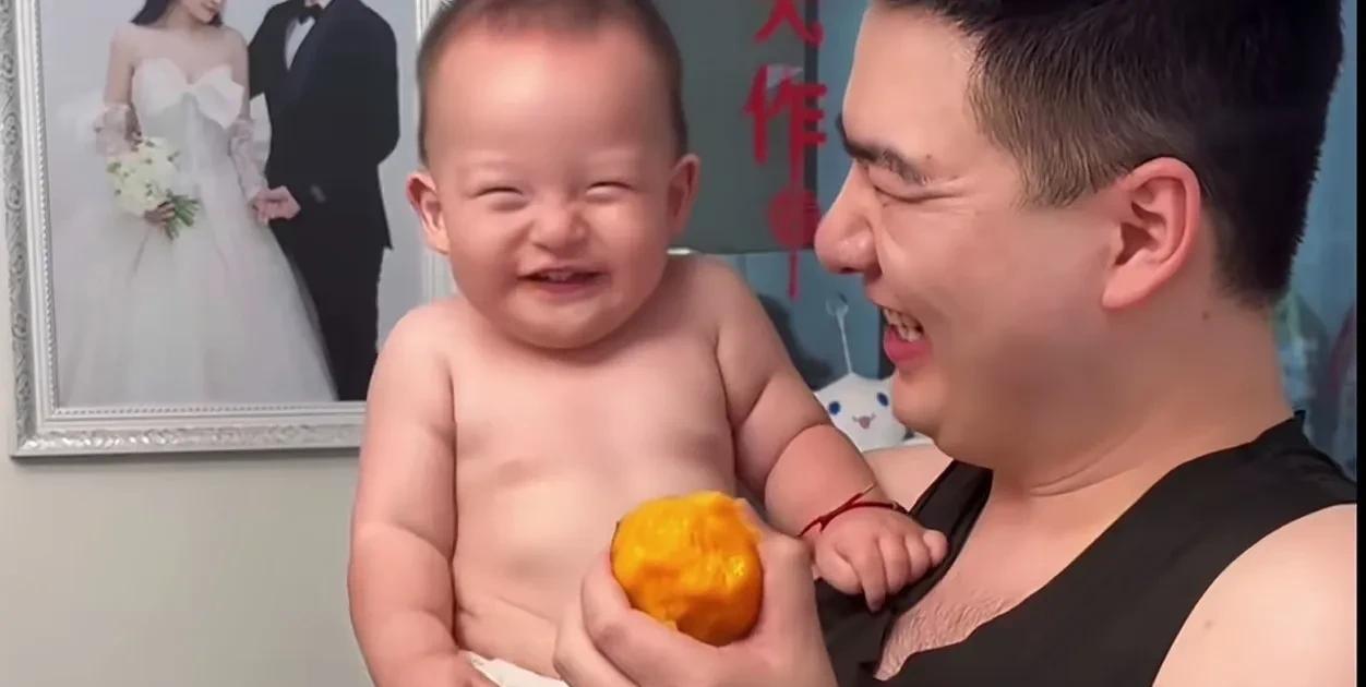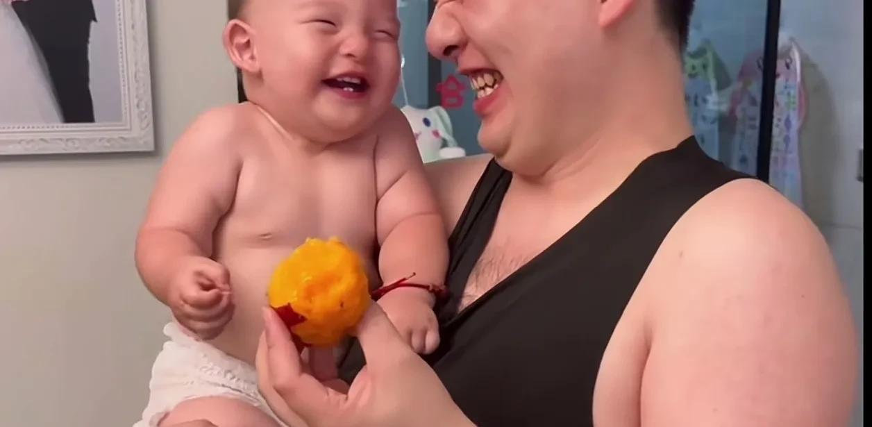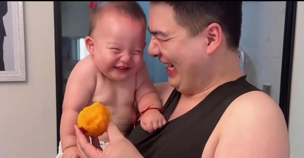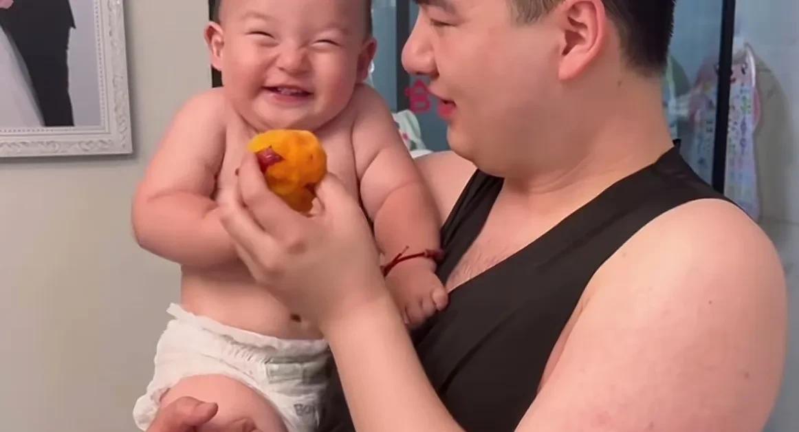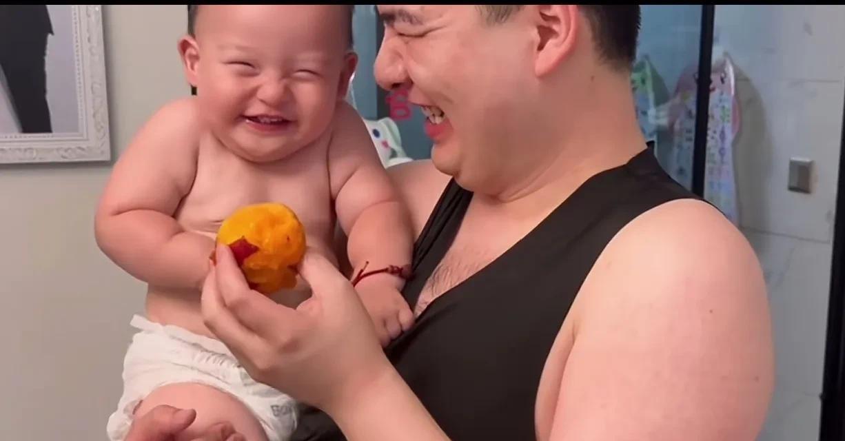 这父子俩的笑容也太治愈了,小宝宝人生第一次吃桃子,开心的笑容隔着屏幕都能溢出来。