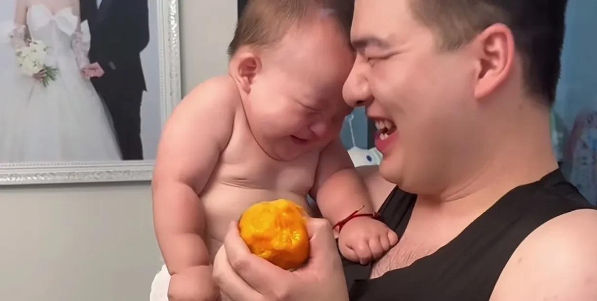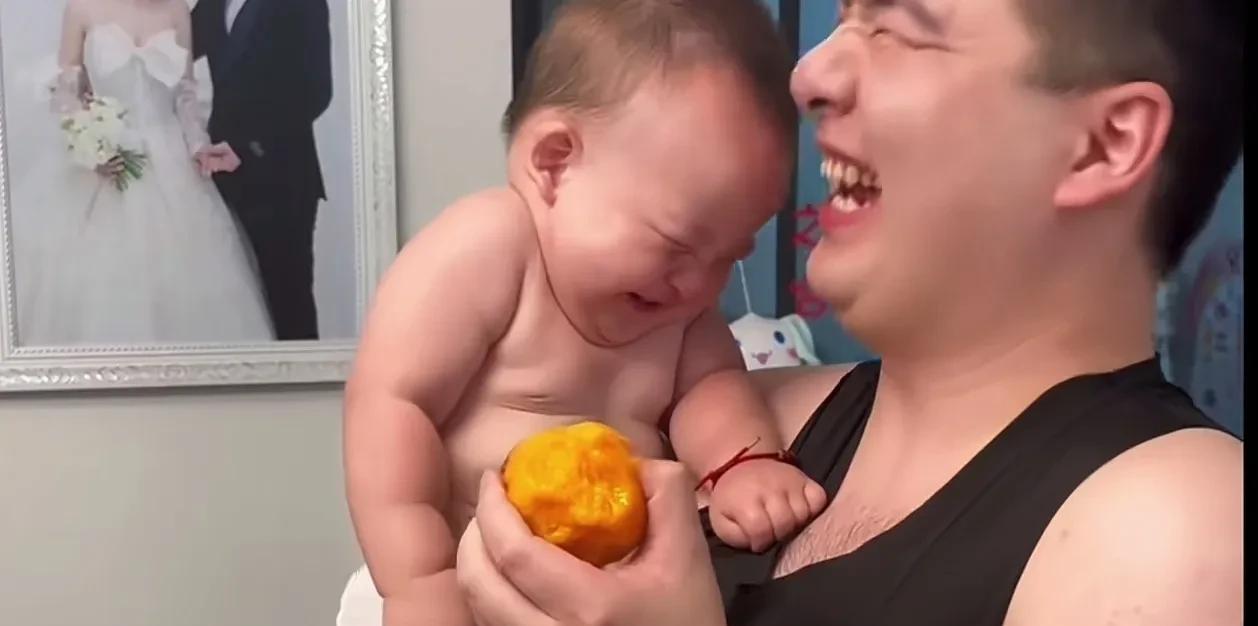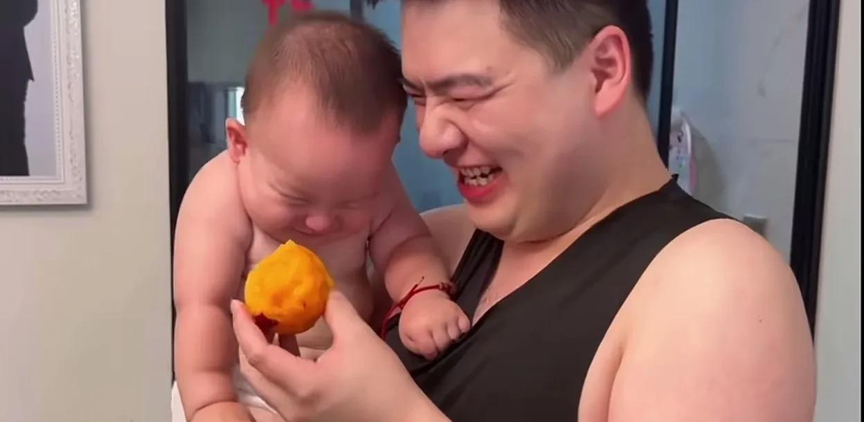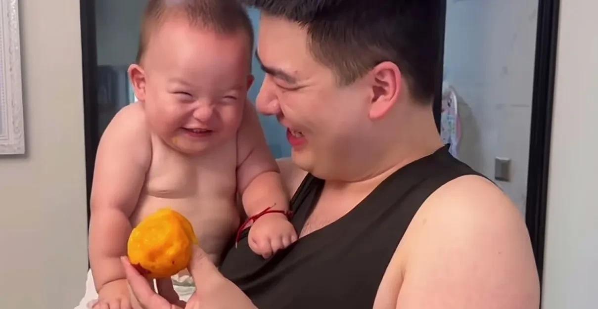 这父子俩的笑容也太治愈了,小宝宝人生第一次吃桃子,开心的笑容隔着屏幕都能溢出来。