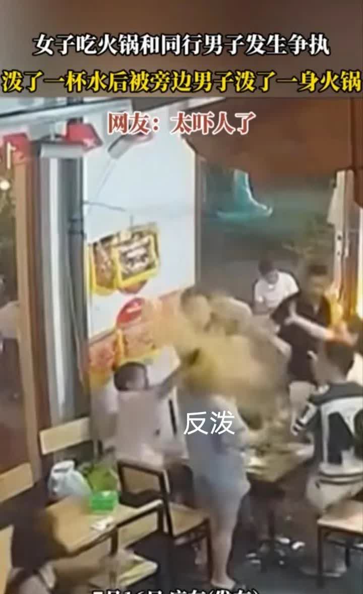 这成什么事啊! 同桌吃火锅起战事,一女子不知为啥突然起将一杯饮料一样的东西泼向对面的男子,穿花衣男子顺手端起吃剩的火锅反泼过去,女子这时可能意识到了危险,就转瞬窘迫的慢慢走开…… 好男不跟女斗,但这名子明显践踏了男人的尊严,可想而知胜负立判! 不管多强横,女人在外千万别先动手!切记切记! 不过,这世界好像从来没有人从别人那里吸取教训,那只好委屈你了——女士!