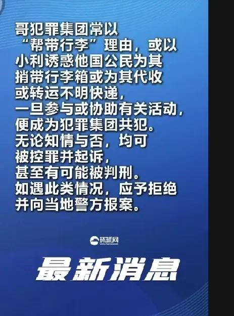 近日,有个中国公民在哥伦比亚替人捎带行李,结果行李里被查出可卡因,直接被警方逮捕羁押。这事儿可太闹心了! 哥伦比亚是世界主要毒源地,可卡因、大麻产量一直居高不下。当地犯罪集团常以“帮带行李”或小利诱惑他国公民,一旦参与就成了共犯,不管知不知情都可能被起诉判刑。 咱中国公民去那儿旅游、探亲可得提高警惕,千万别因为一时大意就陷入这种麻烦。要是遇到让帮带东西的情况,果断拒绝,还可以拨打当地报警电话123 或者国家警察禁毒局电话6015159750 ext 31101报案。 #可卡因危害# #哥伦比亚大发现#