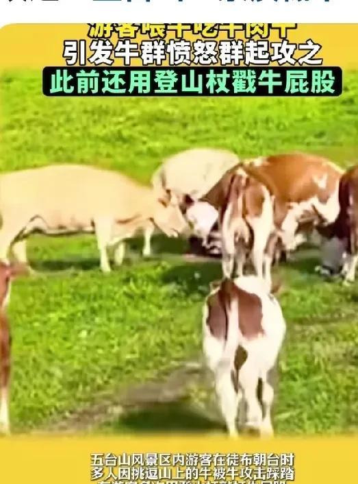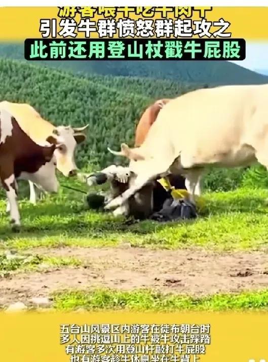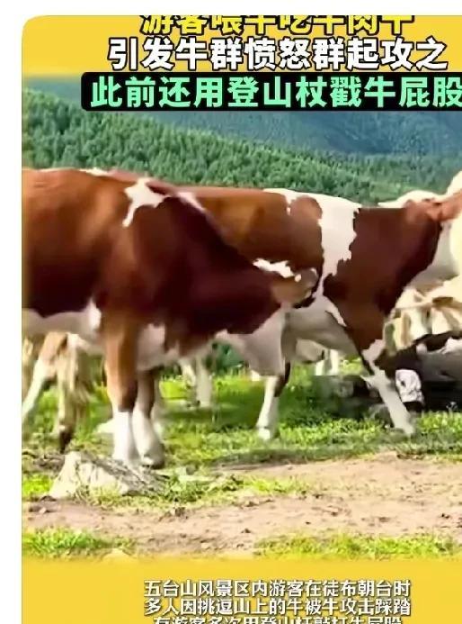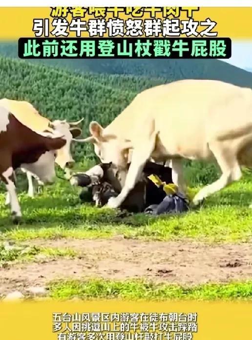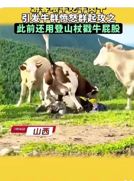 在2025年7月16日,山西忻州五台山风景区内,一些游客在徒步朝台时给牛喂牛肉干,还多次用登山杆敲打牛屁股,甚至趁牛休息时坐在牛背上。这些行为最终激怒了牛群,导致游客遭牛围攻踩踏。 7月17日,五台山管委会工作人员回应称,牛群常年生活在山上,一般不会主动攻击人,此次事件完全是因为游客喂牛牛肉干并用登山杆挑逗牛才引发的反击。虽然被踩踏的游客没有大碍,但这一事件反映出游客个人道德素养的问题,景区方面表示会联系相关部门加强管理,防止类似事件攻击,群体生活的牛只会共同抵御“。#五台山# #游客# #牛肉干# #牛攻击#