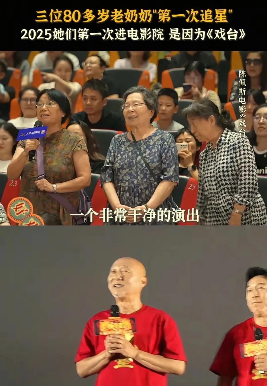 三位80多岁的老奶奶生平第一次追星。她们已经许久不看电影了,却因为《站台》而走进电影院,以此来表达对陈佩斯先生的支持。她们钦佩他的人品,赞赏他对艺术的坚持,觉得这是一场非常纯粹的演出,毕竟如今要找到纯粹的东西可不容易了。