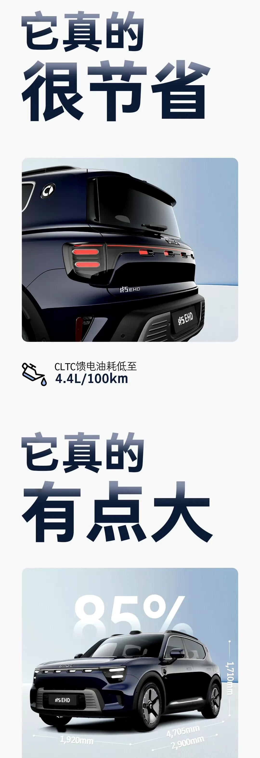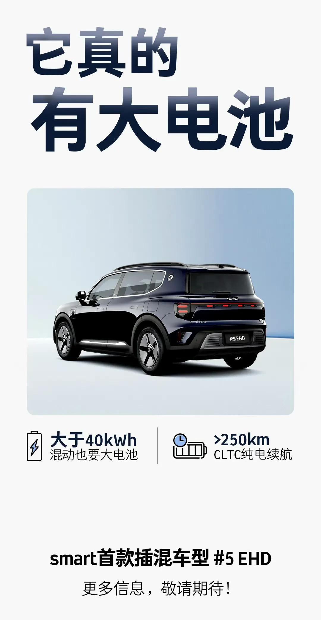 Smart 精灵五号EHD来了,真的很强 新颜色星漩蓝,依然出自奔驰设计手笔,不同光线下会有不同的色彩效果 ,40kWh大容量电池,CLTC纯电续航足足能跑250公里。 日常通勤一周只需要充一次电,一点油都不耗,平时是电车,假期出游的时候能加油,总共1600km+的CLTC综合续航,从北京到上海都妥妥没问题。 轴距2900mm,4705mm*1920mm*1710mm车身尺寸。 #smart# #Smart# #smart评测# #smart新车#