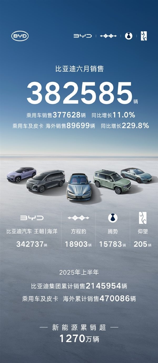 1270万辆!比亚迪笑得合不拢嘴,无敌是多么寂寞,没有一个友商能笑得出来。6月销量,突破38万台,上半年销量,突破214万台,累计销量,突破1270万台!真是不看不知道,一看吓一跳,比亚迪汽车又卖疯了,没有一个友商不羡慕这个成绩,当然对于那些主打燃油车的外国品牌来说,1270万台已经让他们彻底绝望,说难听点就是电车把油车打的满地找牙。既然今年上半年突破214万台销量,意味着比亚迪今年550万台销量目标已经很稳了,因为去年上半年销量是161万台,也就是说今年1-6月份销量同比暴涨33%,而去年下半年销量是266万台,如果今年下半年继续保持33%的增速,那销量就是266万台×33%+266万台=353.78万台,所以今年的总销量就可以达到214万台+353.78万台=567.78万台。