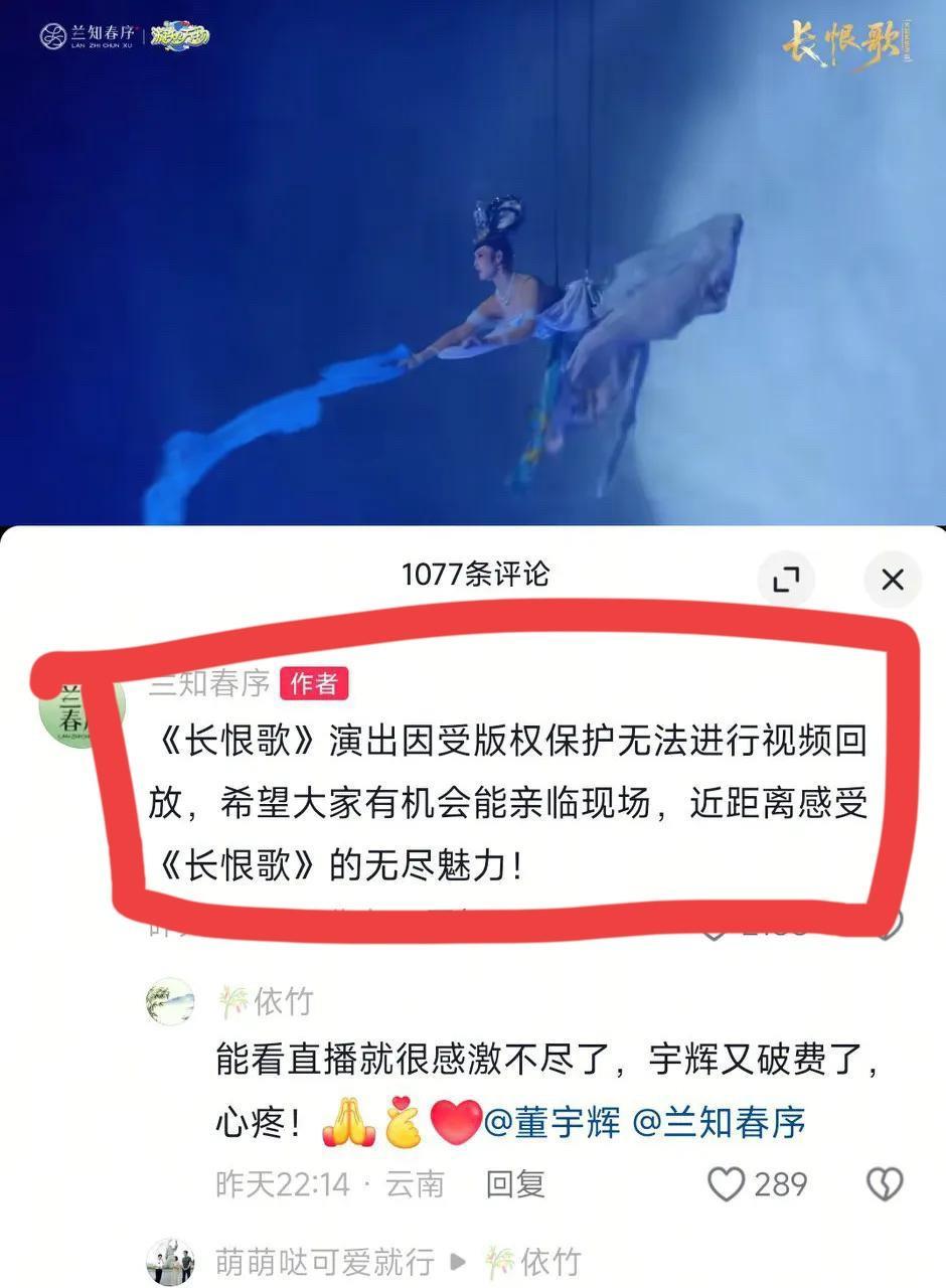 错过看直播实在是太遗憾了! 满心以为安排别的事情回头再看直播! 没有想到的是 今早起来一看兰知春序后台留言: 因为版权问题《长恨歌》直播无法回放! 这简直就是一个晴天霹雳! 这是一心以为会有回放的友友们 错失观看绝美大唐盛世演出的机会! 看图二兰知春序账号下的作者回复 心里真的是错过“一个亿”的感觉! 到西安不看《长恨歌》 简直就跟没来过西安一样! 彪哥是为了宠爱自己的粉丝 又花了大价钱啊! 人家这么多年 总共只有两次直播的允许 都给彪哥了! 只能说,彪总太给力了, 为粉丝又破费了! 看到有粉丝朋友留言, 两个多小时的演出自己有全程录屏! 这手机内存也太给力了吧! 有机会能录下这么精彩的演出! 这视频可得好好保存! 也算是珍藏的一份珍贵的数字文化资产! 可要好好保存! 同时也要注意版权问题, 可以自己无限回放,但是万万不可泄露! 这么美好的演出,谁错过谁遗憾! 你说是不是? 昨晚都有谁错过了? 可以在评论区说说错过的原因! 让你我彼此好好安慰一番! 也算有人陪伴不孤单!