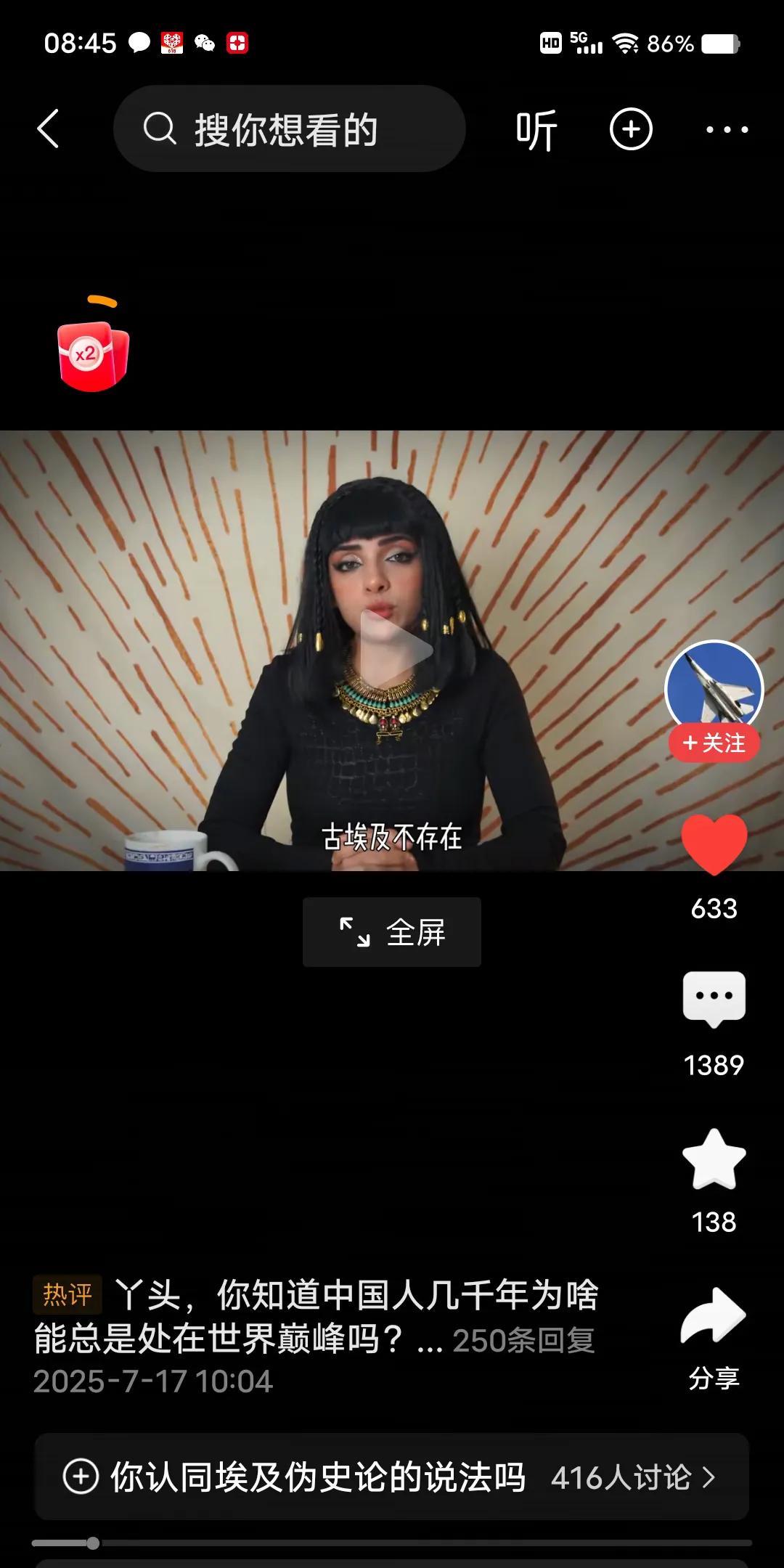 这个图片中的女孩经常发布一些宣传埃及文物的视频,教授的一眼假可以说是砸人家的饭碗了,人家要跳出来喷一下,情有可原啦,不过还是要回到事实上的,埃及,地处沙漠,物产贫瘠,是怎么产出养活足够支撑起两个文明(古埃及,古希腊)的粮食的?如果没有足够的粮食养活足够的人,没有足够的人口基数,那么一切都是空中楼阁。 再说一个,就那个草鞋,真的符合常识吗,那个草鞋是人字拖造型吧,那个带子那么长,怎么穿啊?要么古埃及人的脚是异形,要么草鞋是杜撰出来的,两个你总得选一个吧?