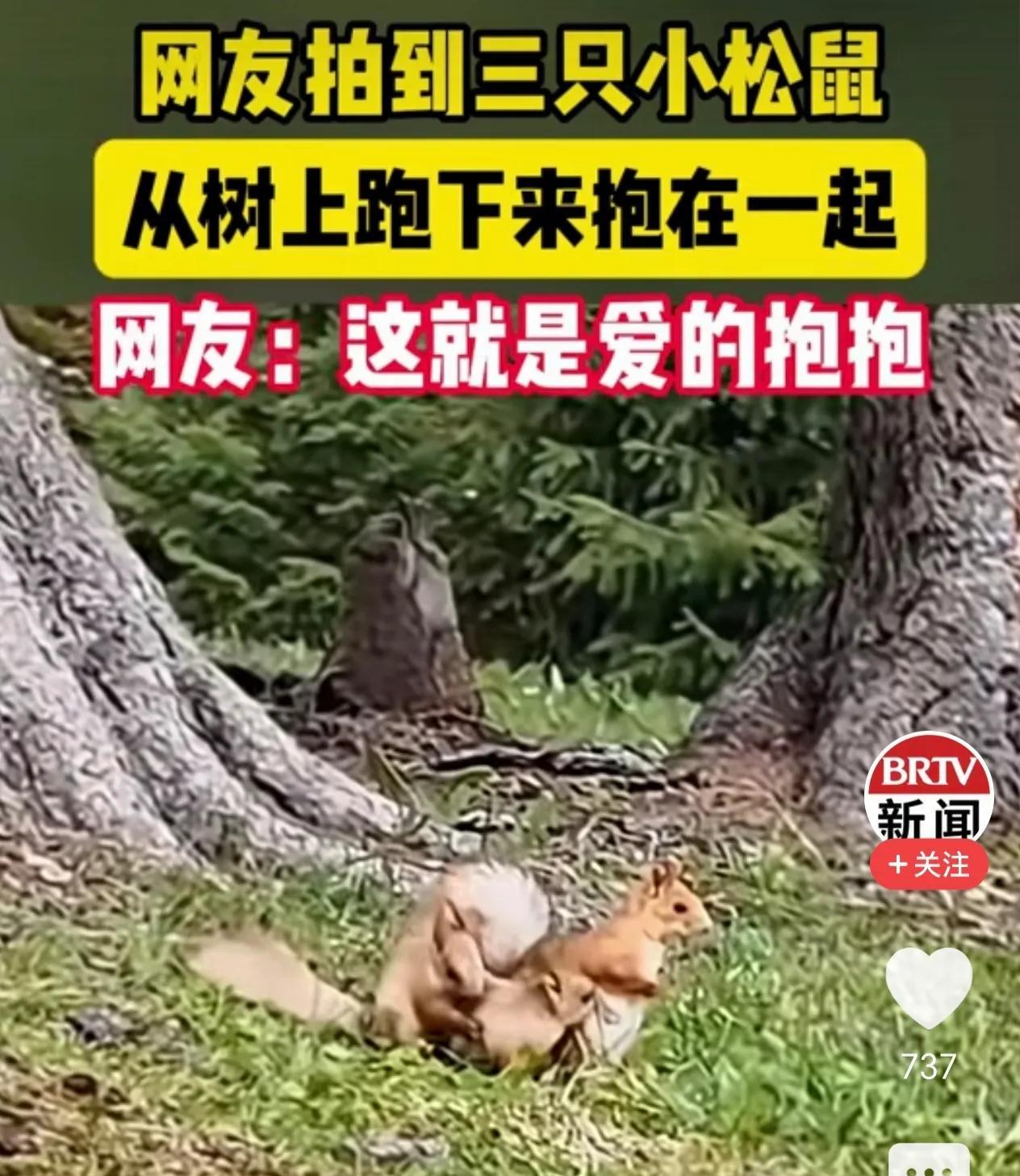在树林里,有网友拍到三只小松鼠陆续从树上下来玩耍,三只松鼠在玩耍中竟然摆出了依次