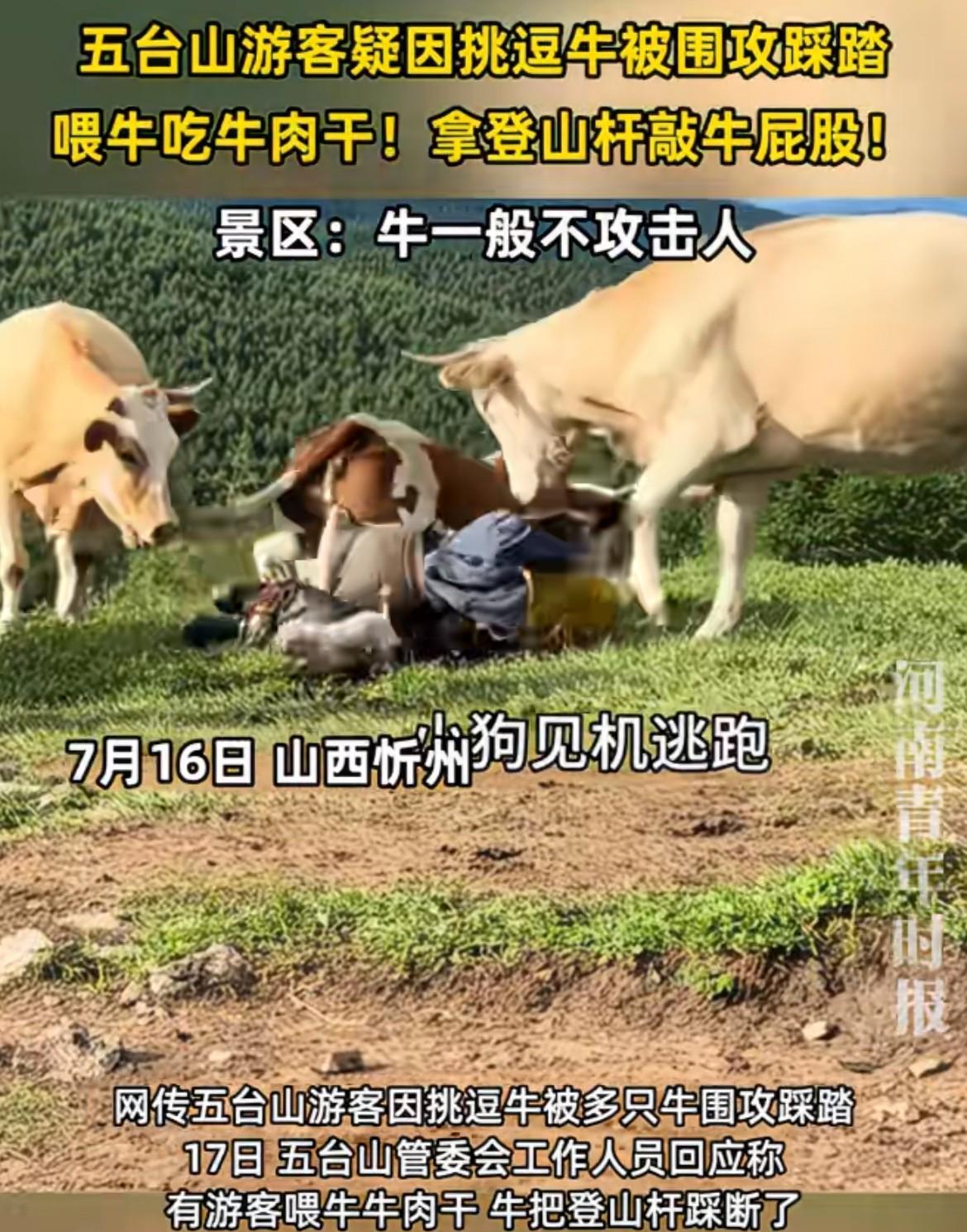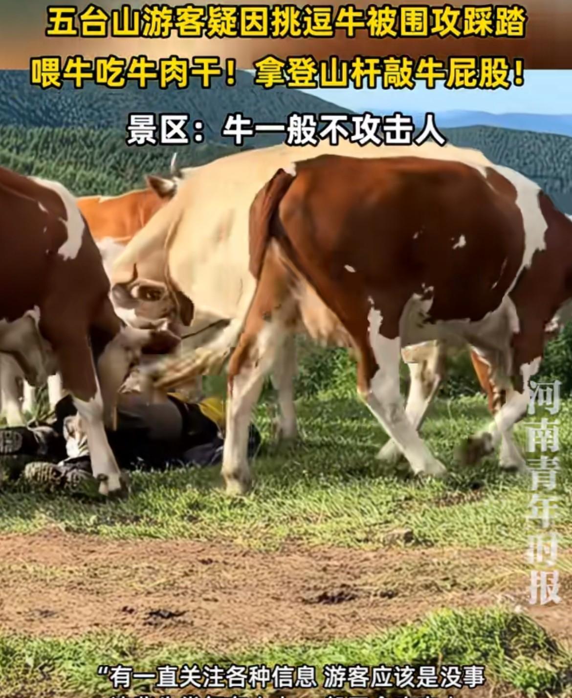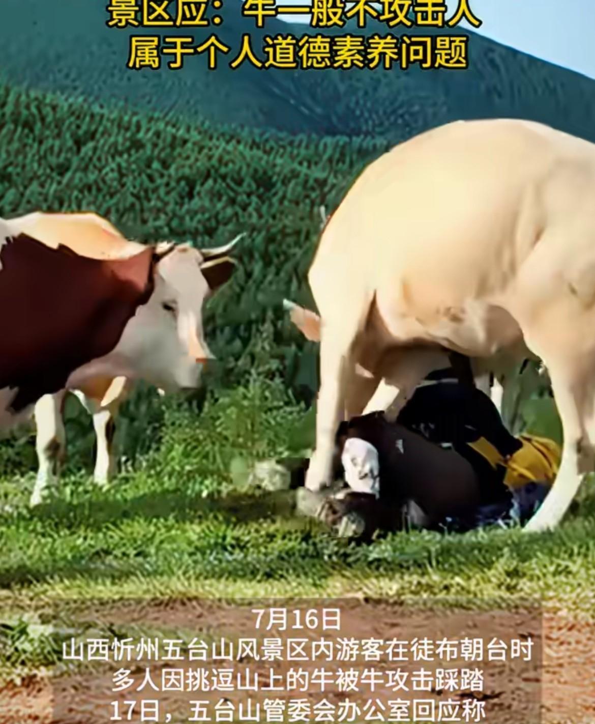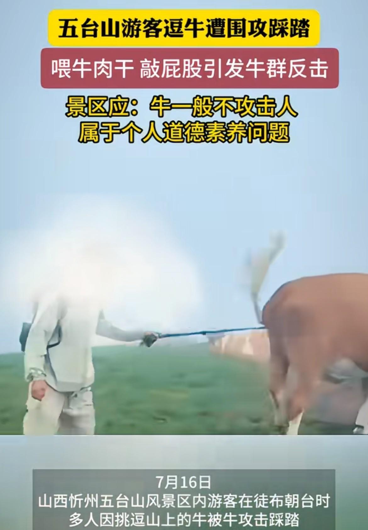 "快,快,救救我”!随着一声声惨叫闻声望去,原来是一名游客被几头壮牛不停的踩踏着,但是旁边的游客没有一个敢上前。 看着这游客抱着头,想翻滚出包围圈,但是这几头牛彻底被激怒,丝毫不给游客反击的机会。这一幕被网友发在网上,引网友热议: 有知情网友说:这是在山西五台山游客用牛肉干逗牛,还用手里的登山杖捅牛屁股,这种举动让这些牛发怒,群起而攻之! 好在事后有惊无险,当事人只是脚步受伤,脸和手有轻微擦伤,头被牛踩出一个脚印,算牛脚下留情了,命大了啊。 还有网友说当事人:去五台山求佛保佑都保护不了你,你这是有多坏,给牛喂牛肉干,活该被牛围攻,真的是坏到骨子里了。 牛是非常有灵性的动物,轻易它们不会攻击人类,这把老实的牛都给惹急了,肯定是做了不该做的恶事儿! 事后,景区也回应了此事:牛一般不攻击人,被牛攻击的这个人属于道德素养问题,景区没有任何责任。 这一次,肯定让这位游客记一辈子,估计以后再也不敢了! 真的是不作不死,要不是后来景区人员及时出现,就直接葬送在牛蹄子下了。