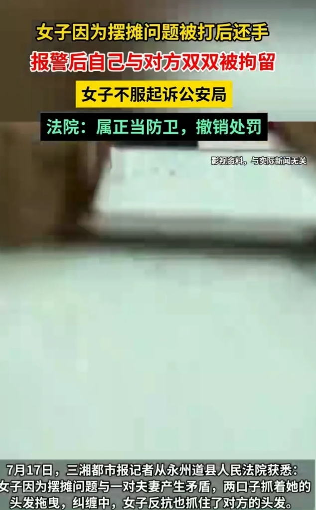 被打还手,不再算互殴!湖南永州,女子在公园摆摊,和一对夫妻摊贩发生过矛盾,双方口头约定,谁也不能在此地摆摊。女子偷摸摆摊时被发现,夫妻2人对女子一顿胖揍,女子还手,两个女人互撕头发。3人都不同程度受伤。警方介入后,3人均被拘留处罚。女子不服,认为自己是被迫还手,将警方告了,要求撤销对其作出的行政处罚。法院判决,大快人心。网友:终于扳回一局!