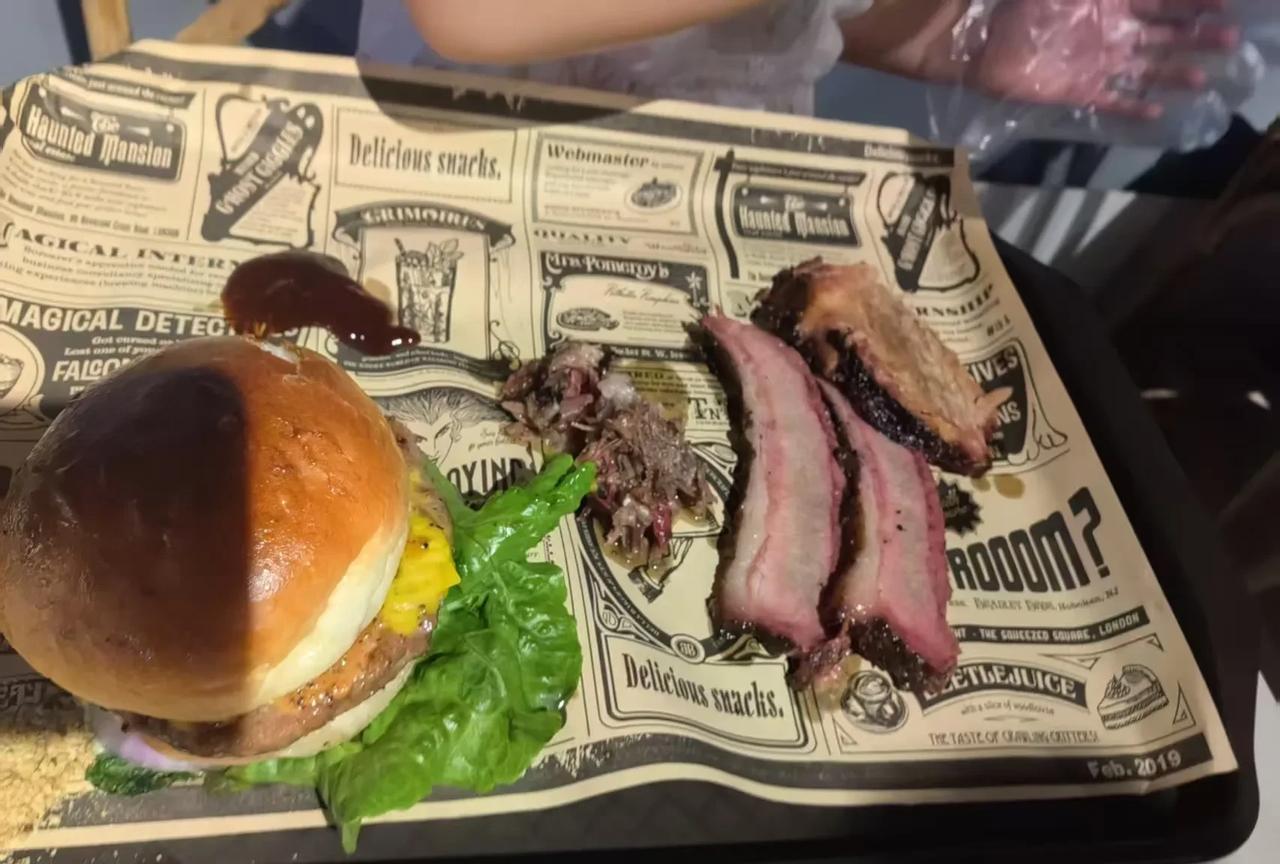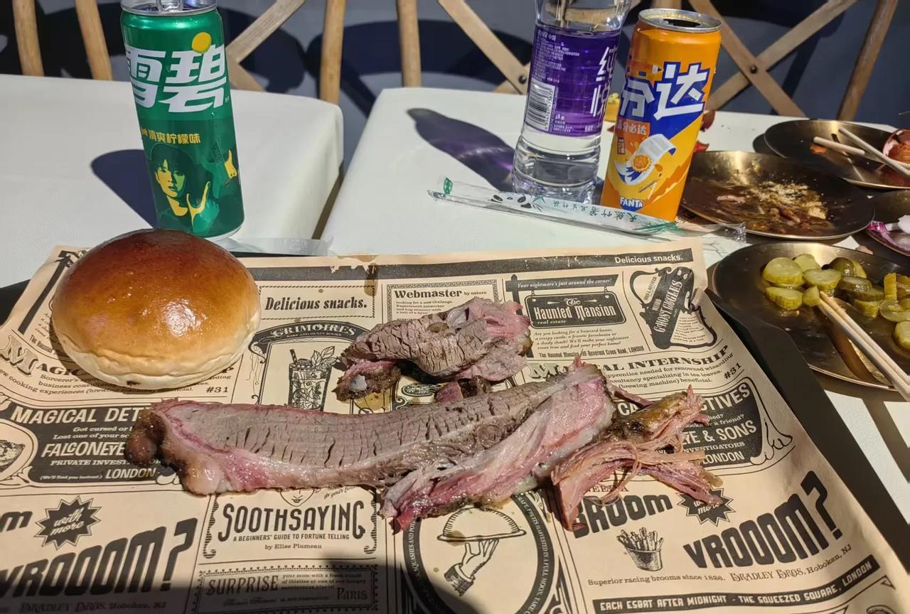 现在的饭店这么不讲究了吗?经过五六个小时低温熏烤,烹得外焦里嫩的美式烤肉,切成一