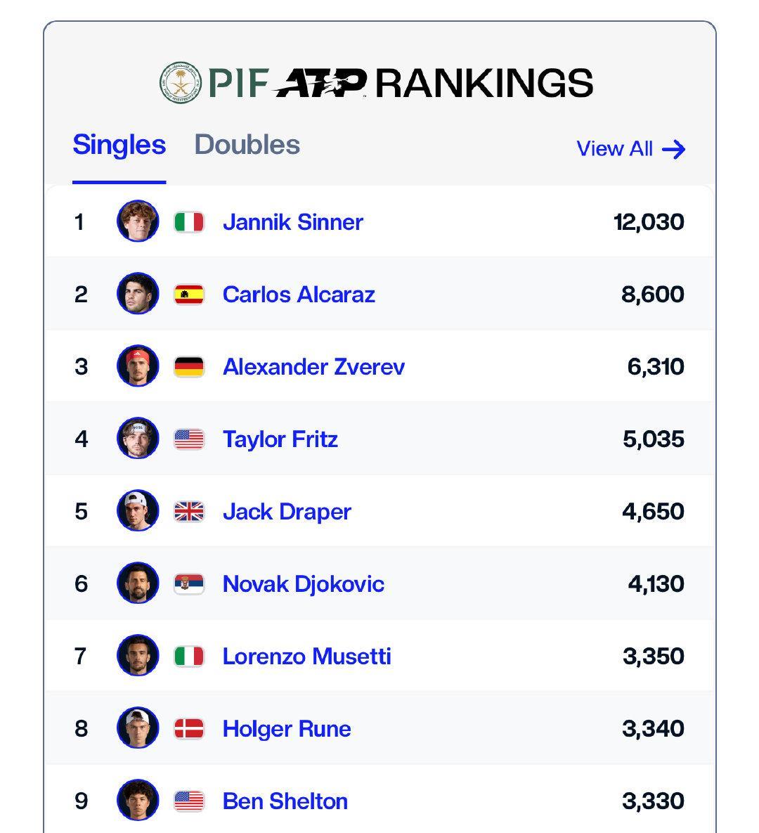温网结束后,2025赛季也进入下半程。在温网首次夺冠的辛纳以12,030分继续领
