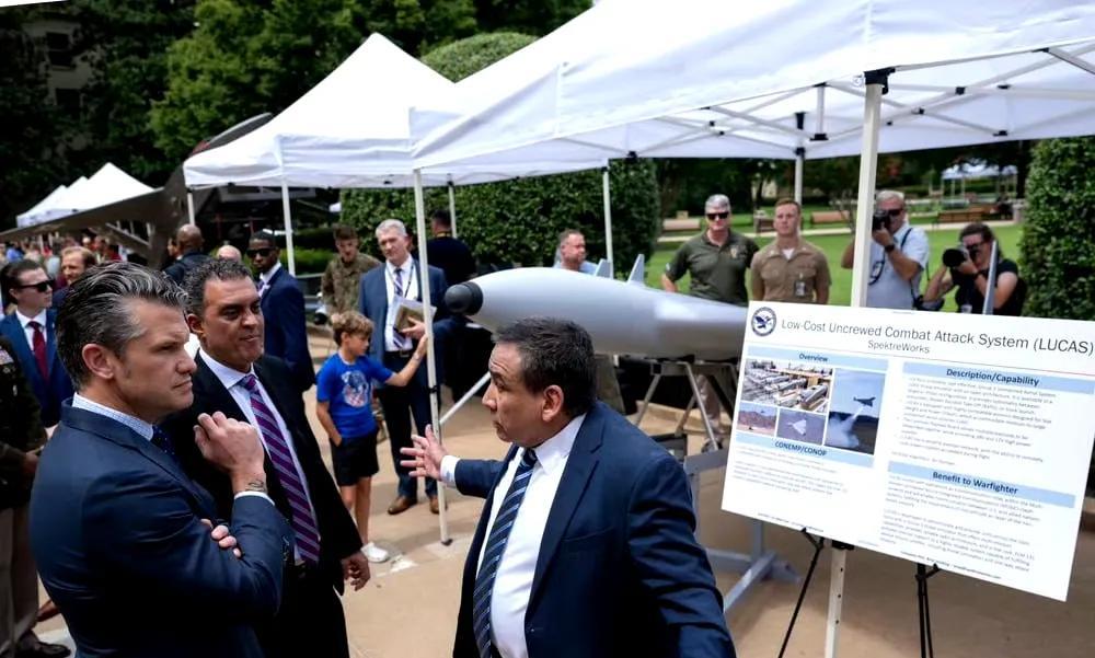 俄罗斯仿制伊朗,美国仿制俄罗斯!美国国防部长赫格赛斯,参观美国军火工业最新产品——LUCAS低成本无人作战攻击系统,其实就是仿制俄罗斯"天竺葵"-2自杀无人机,也就是仿制伊朗"沙希德"-136自杀无人机。 美国这个LUCAS无人机,飞翼布局、小型二冲程汽油发动机、尾部螺旋桨驱动、民用级飞控和导航。连最初的型号都叫FLM-136,完全是复刻"沙希德"-136。但是美国公司要价3.5-4万美元,比俄罗斯产品贵一倍。而目前供应乌克兰的同类品,竟然单价高于10万美元! 但是美国捏着鼻子也得要——未来战场500-1000公里级别打击弹药,数量占绝大部分的就是这种自杀无人机,现在俄罗斯每天造100多架,每年近40000架。那些每年以千计数的更昂贵、更复杂的精确制导武器,根本没法替代自杀无人机。谁量产这种自杀无人机,谁才能拿到当前和未来军事对抗中大战、持久战、消耗战的入场券!