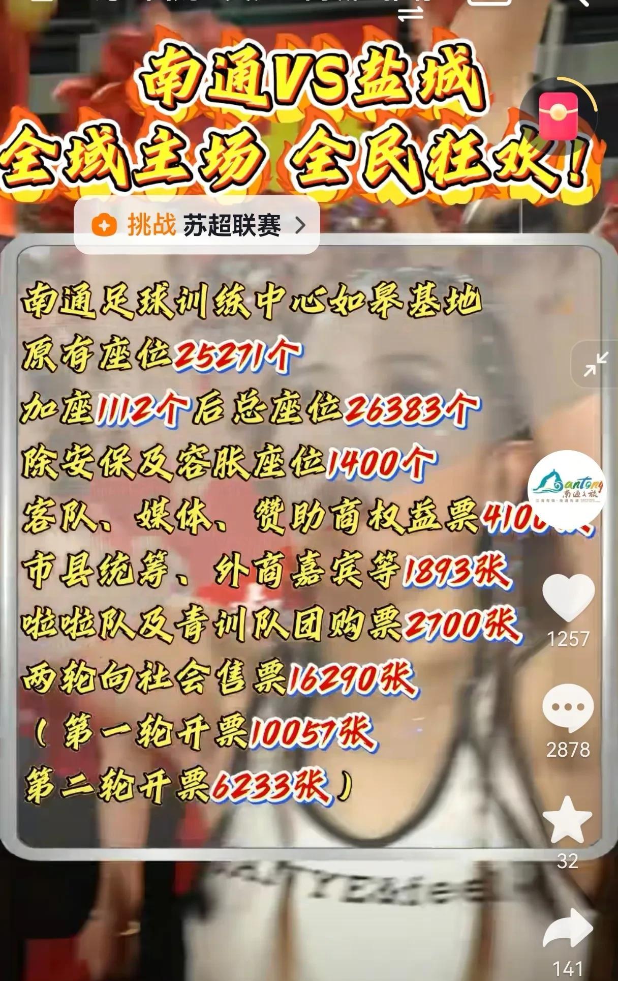 今天中午,南通文旅公布了本轮苏超联赛南通球票的详细数据,前几天乌烟瘴气的各种舆论